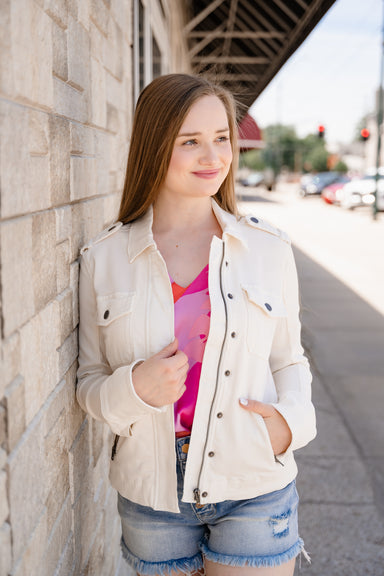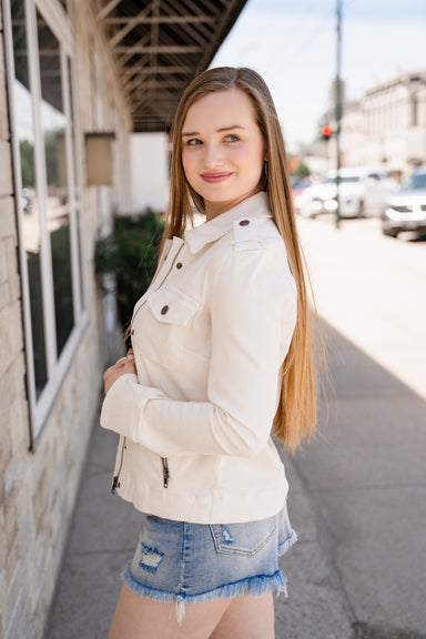 Elevate your style with this playful faux leather bomber jacket. Its sleek design and soft texture add an edgy vibe to any outfit, while the comfor...