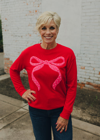 Wrap yourself in festive charm with our Pearl Bow Classic Sweatshirt. Featuring a bright red base and an oversized pink bow applique adorned with d...