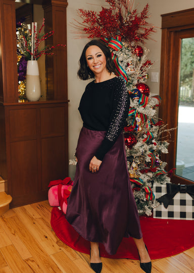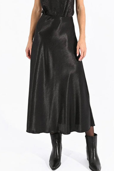 Slip into effortless elegance with this long satin black skirt, designed to captivate with its fluid silhouette and lustrous sheen. Featuring a hig...