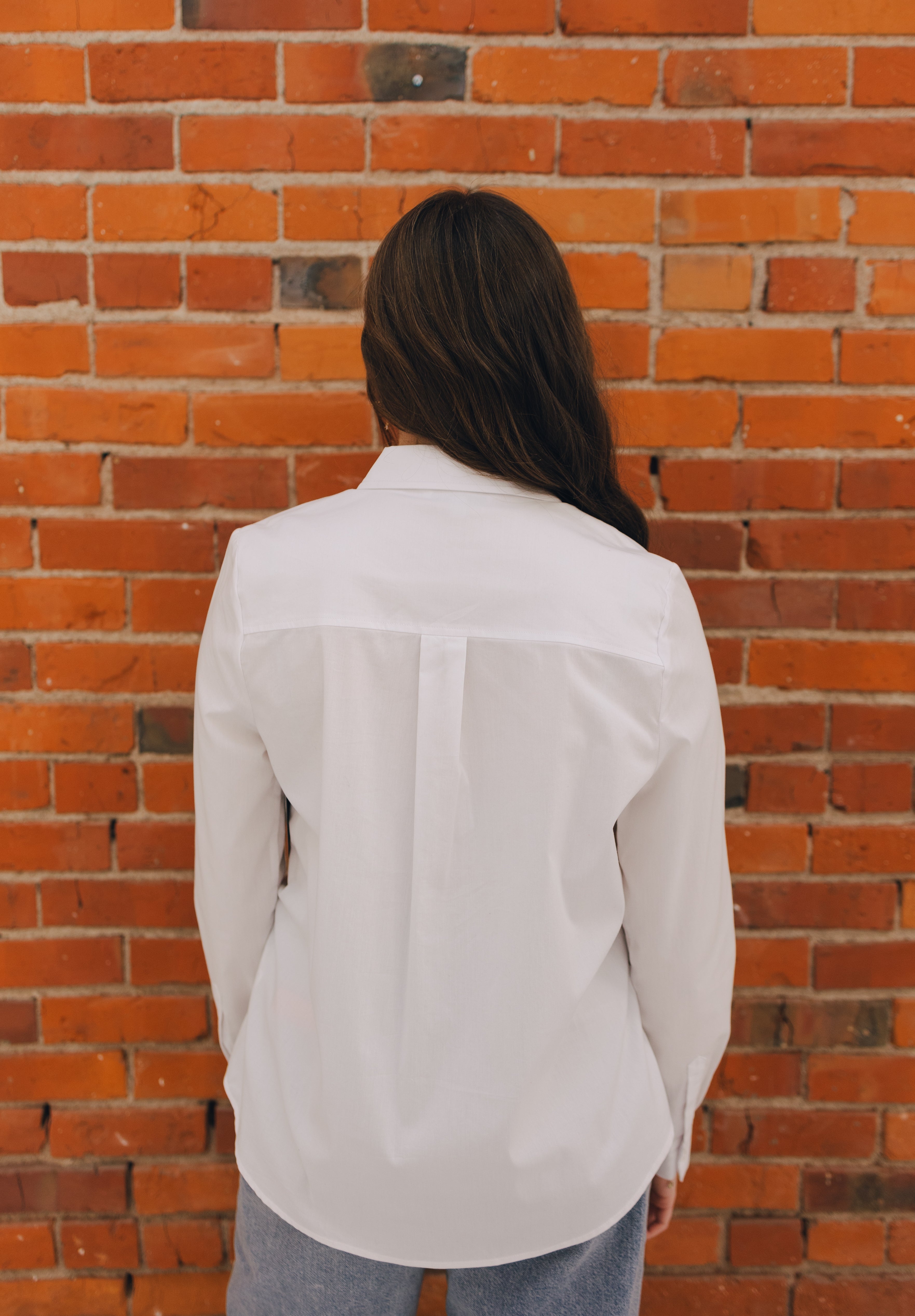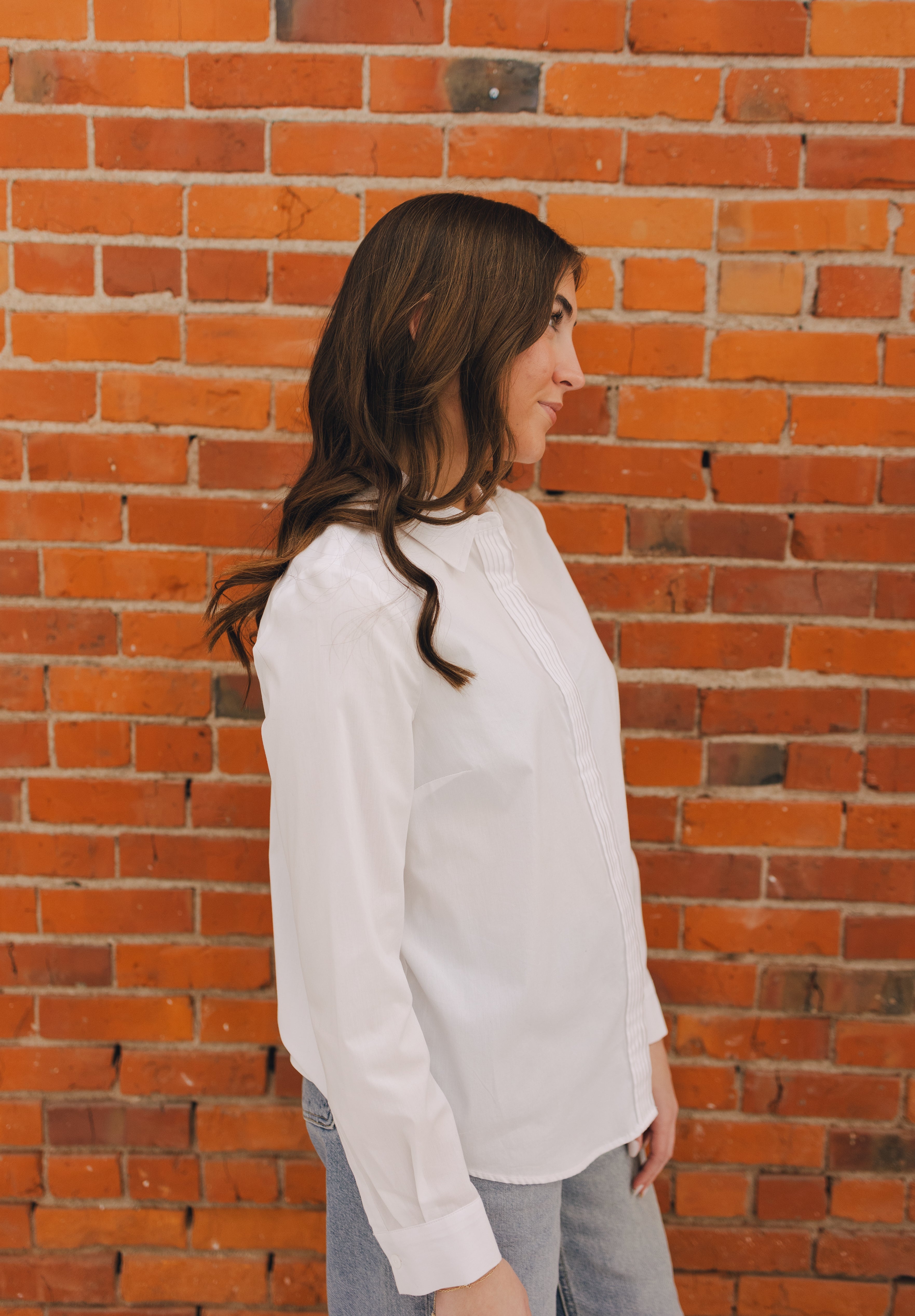 The beautifully tailored white hidden placket shirt fills the hole in your closet! Reach for this without even thinking! The perfect versatile shirt that can be worn for work or casually with denim.