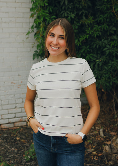 The Cooper Top is a relaxed-fit stripe tee with a crew neckline and short sleeves. Finished with a contrast ribbed band, it's a casual and comforta...