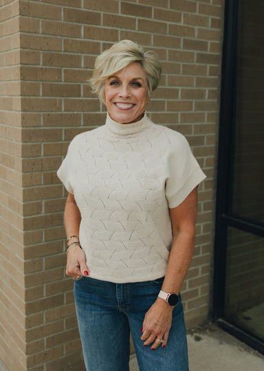 Cozy meets cool in this textured mock neck sweater with playful half sleeves. Perfect for layering or wearing solo, its unique texture adds a fun t...