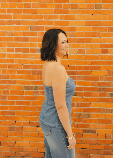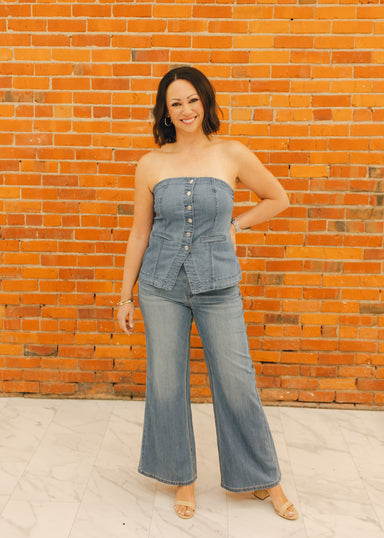 Reimagine denim dressing with this button front denim bustier top, expertly tailored for a structured silhouette and flattering fit. Premium stretc...