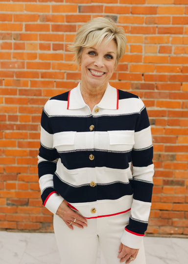 Complete your look with a polished touch in this cozy cardigan, featuring a playful stripe pattern and a refined collar. The double-knit jacquard f...