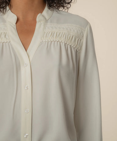 This soft long-sleeve top features a refined mandarin collar and a classic button-down front for a timeless, polished look. Delicate lace and scall...