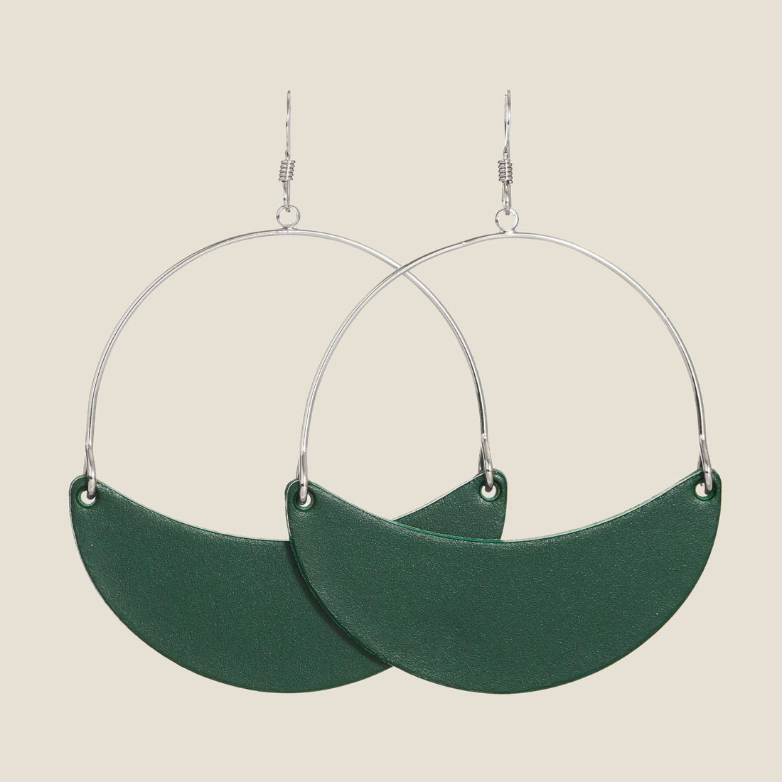 Evergreen is a classic warm-toned forest green leather with a smooth texture. The leather statement piece of this design is attached to your choice of silver or gold hoop hardware.