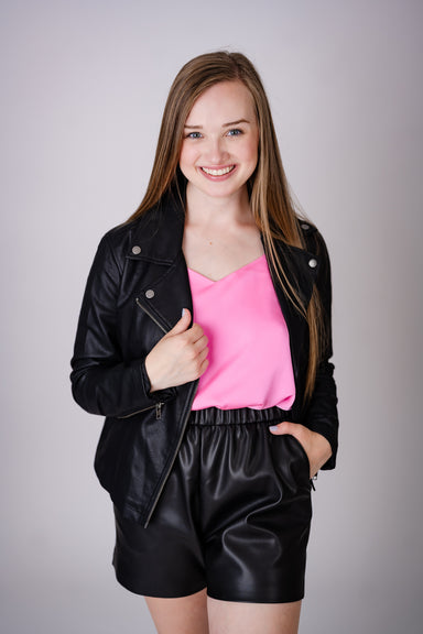 In a soft Camel hue, this modern biker jacket brings a refined attitude to any look. Designed with a sleek zip front, snap-tab collar, and minimali...