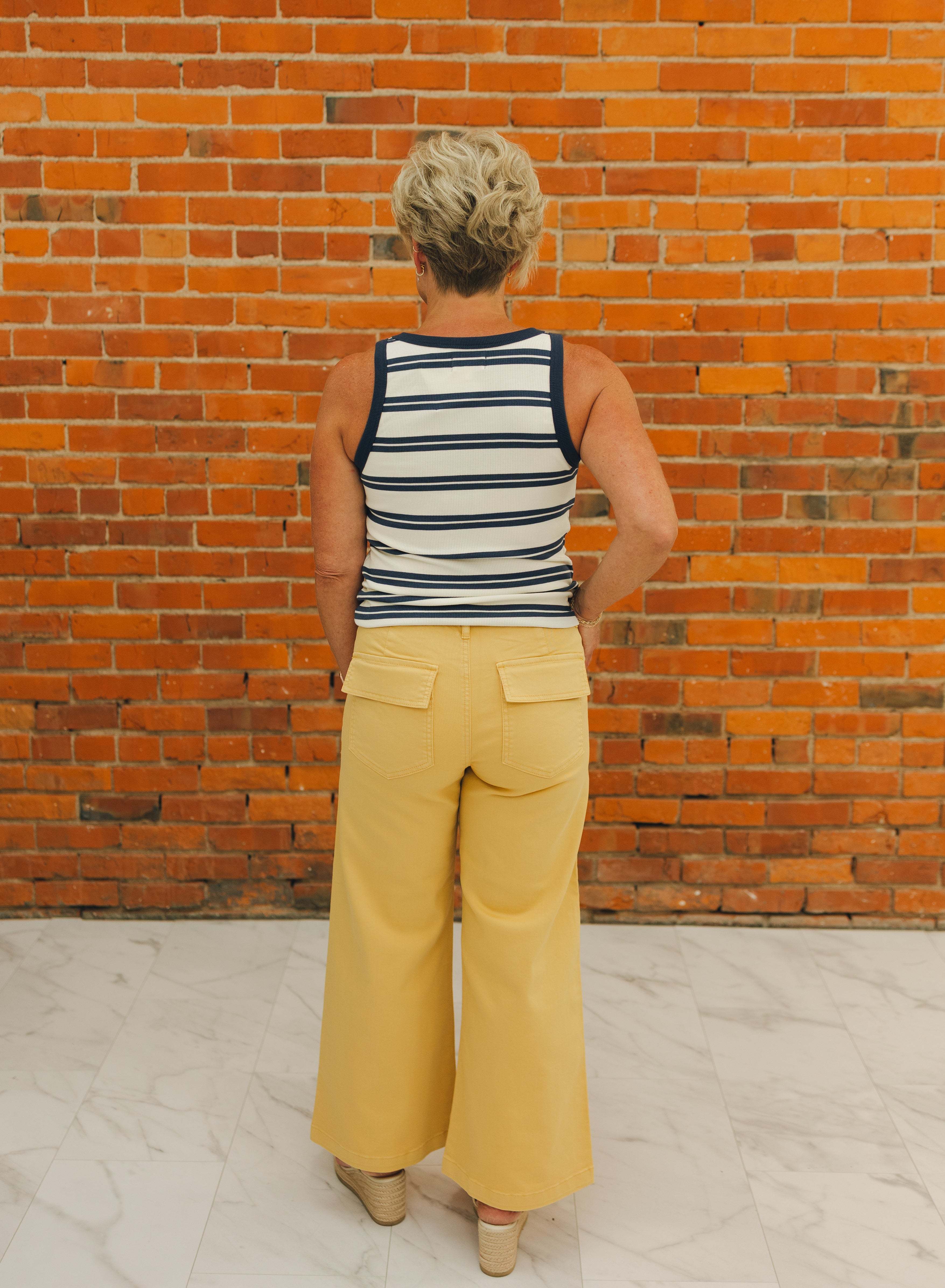 Brighten up your wardrobe with these high rise pants in a vibrant Dandelion hue. The wide leg silhouette offers effortless flow, while the unique pork chop pockets add a functional yet stylish edge.