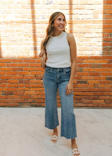 Say goodbye to uncomfortable waistbands with our Risen Mid Rise Crop Wide Jeans! Not only are these jeans stylish with their cropped and wide leg d...