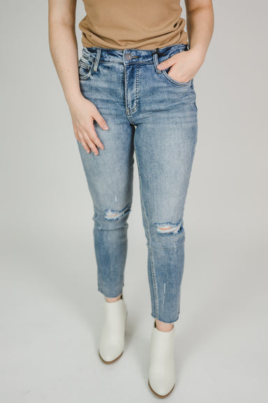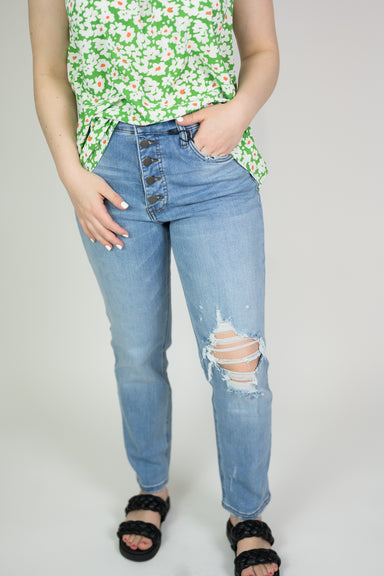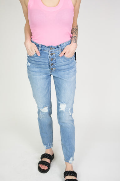 Stay on trend with these high rise wide leg jeans in a classic medium wash. Featuring stylish front patch pockets and a cool raw hem. Easy to dress...