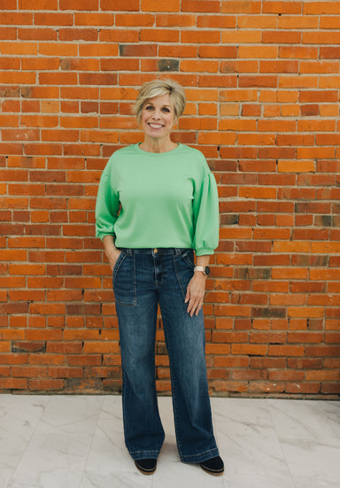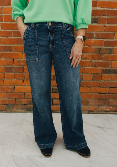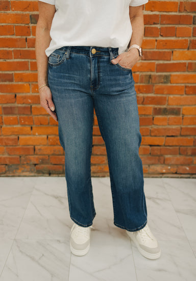 These high rise wide leg jeans feature our signature Fab Ab pockets for a flattering fit. Made with super stretchy fabric and finished with a trend...