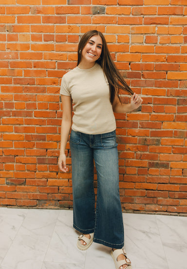 These high rise wide leg jeans feature our signature Fab Ab pockets for a flattering fit. Made with super stretchy fabric and finished with a trend...