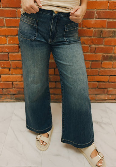 Step up your denim game with these high-rise wide leg jeans in a flattering dark wash. Designed with porkchop pockets, a wide hem, and made from st...
