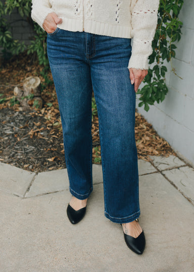 Step up your denim game with these high-rise wide leg jeans in a flattering dark wash. Designed with porkchop pockets, a wide hem, and made from st...