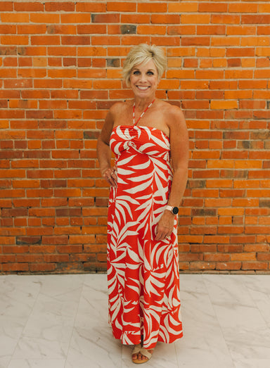 Sun-drenched days call for this tropical-print bandeau halter dress, complete with a center tie and a smocked back for the perfect fit. With a bod...