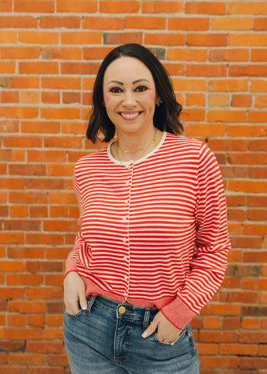 The Montana Cardigan is a lightweight, long-sleeve stripe knit cardigan with a relaxed fit, button-down closure, and a subtle front bottom slit. De...