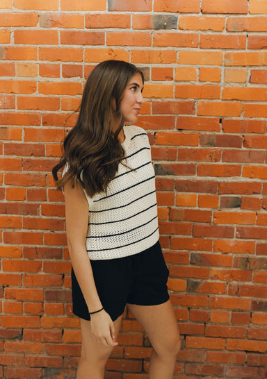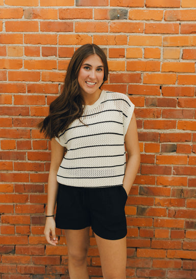 This structured sleeveless sweater is knit in an airy, engineered crochet pattern with a crew neckline and a softly rounded hem. The relaxed fit a...