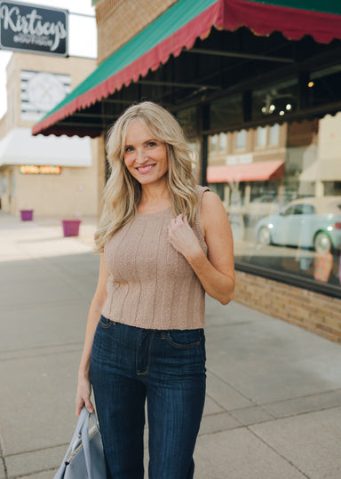 Made from soft, pebbled sweater yarns, this fitted ribbed crop top is the perfect balance of cozy and chic. With a bra-friendly sleeveless des...