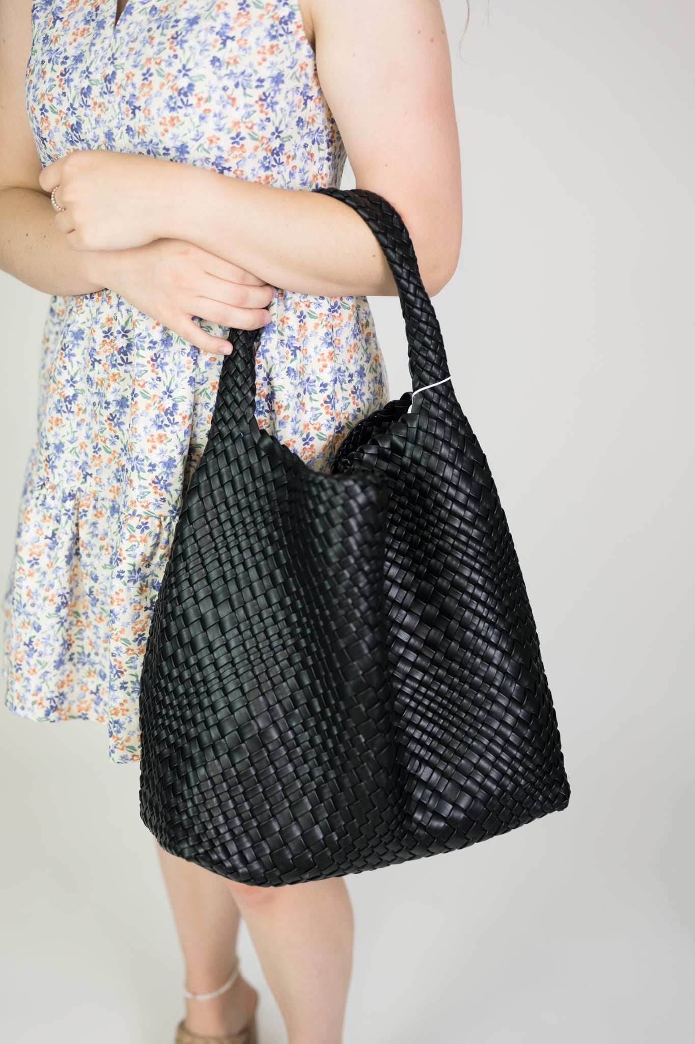 The Blythe Hobo bag. Black braided material. One big pocket with magnet closure.