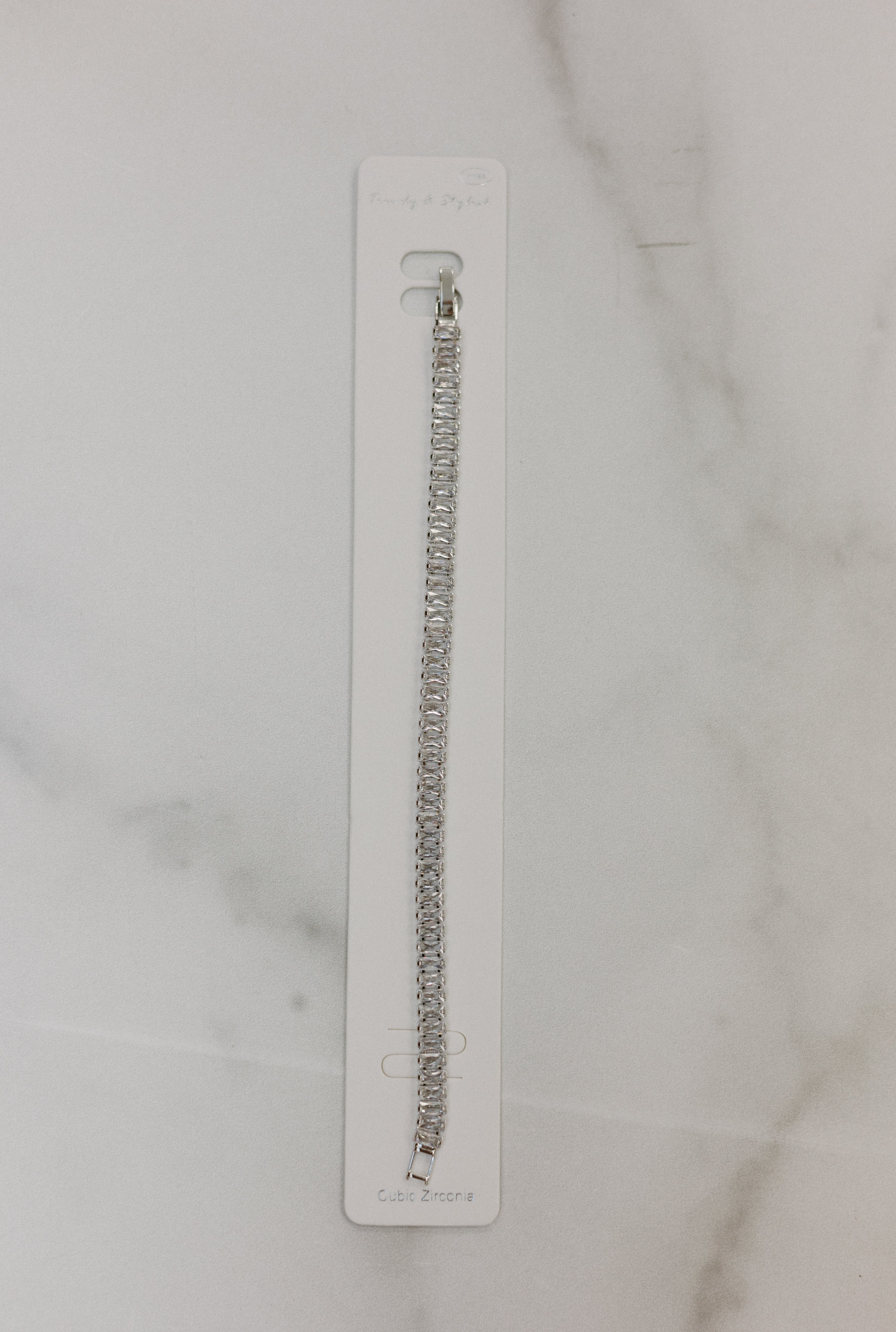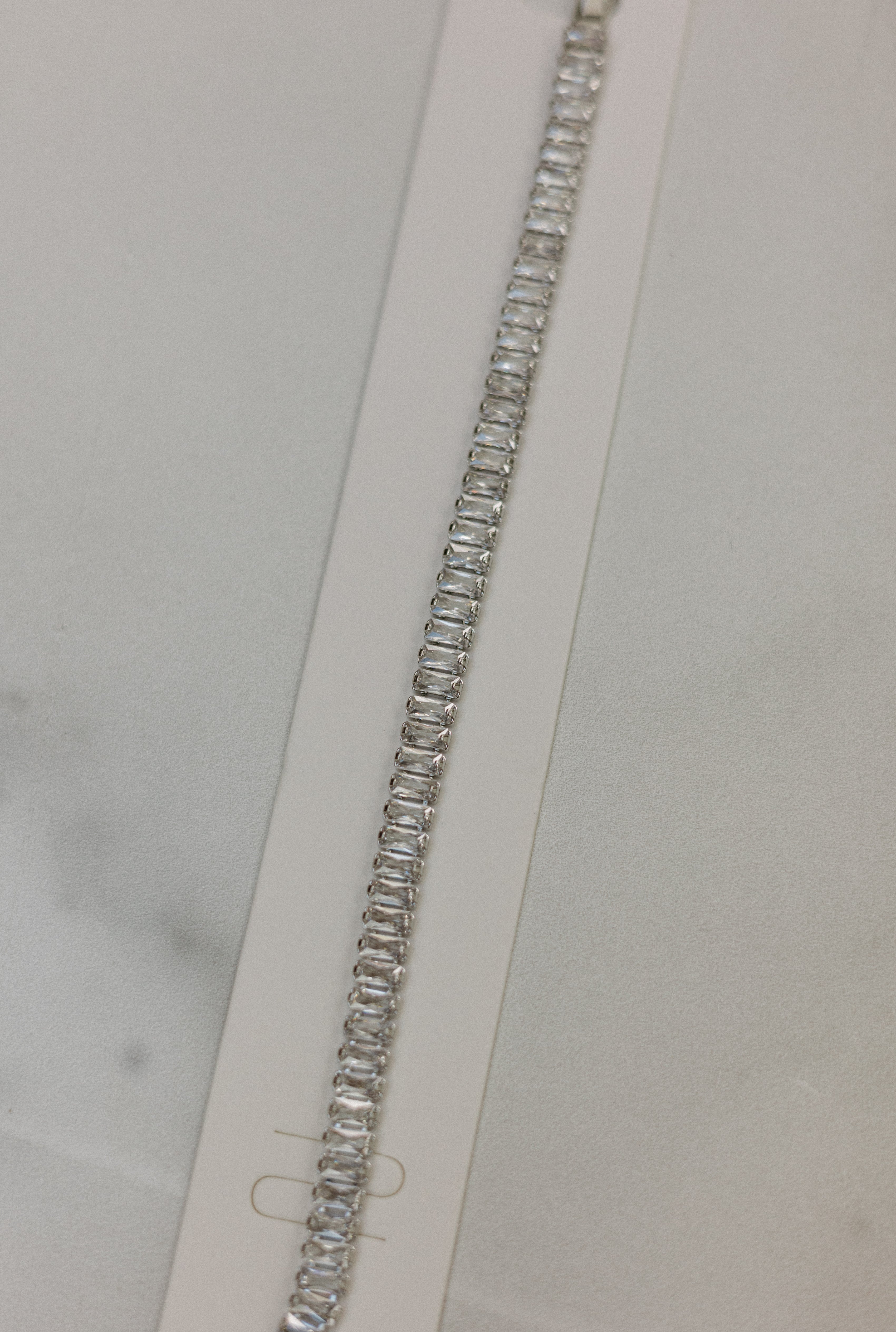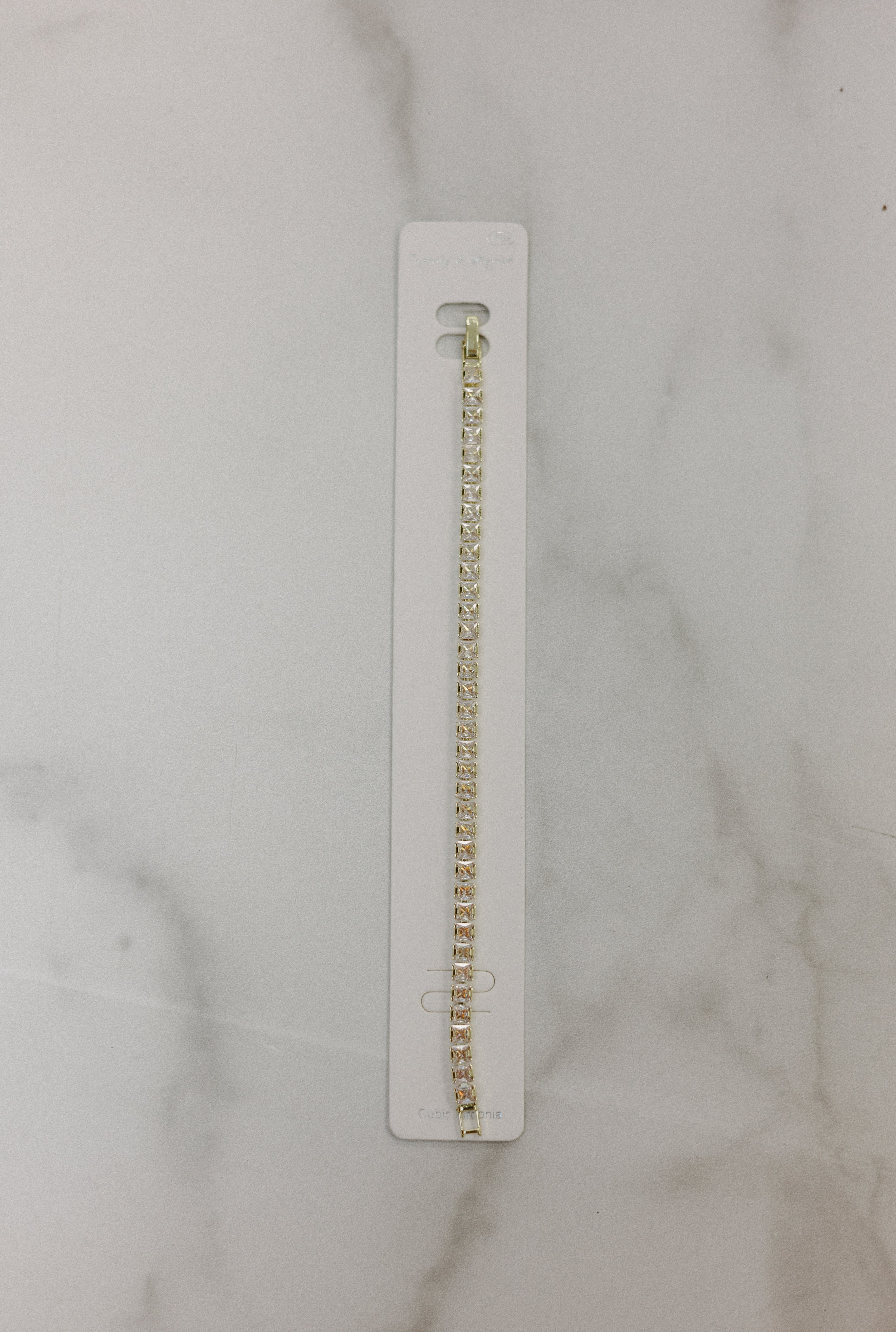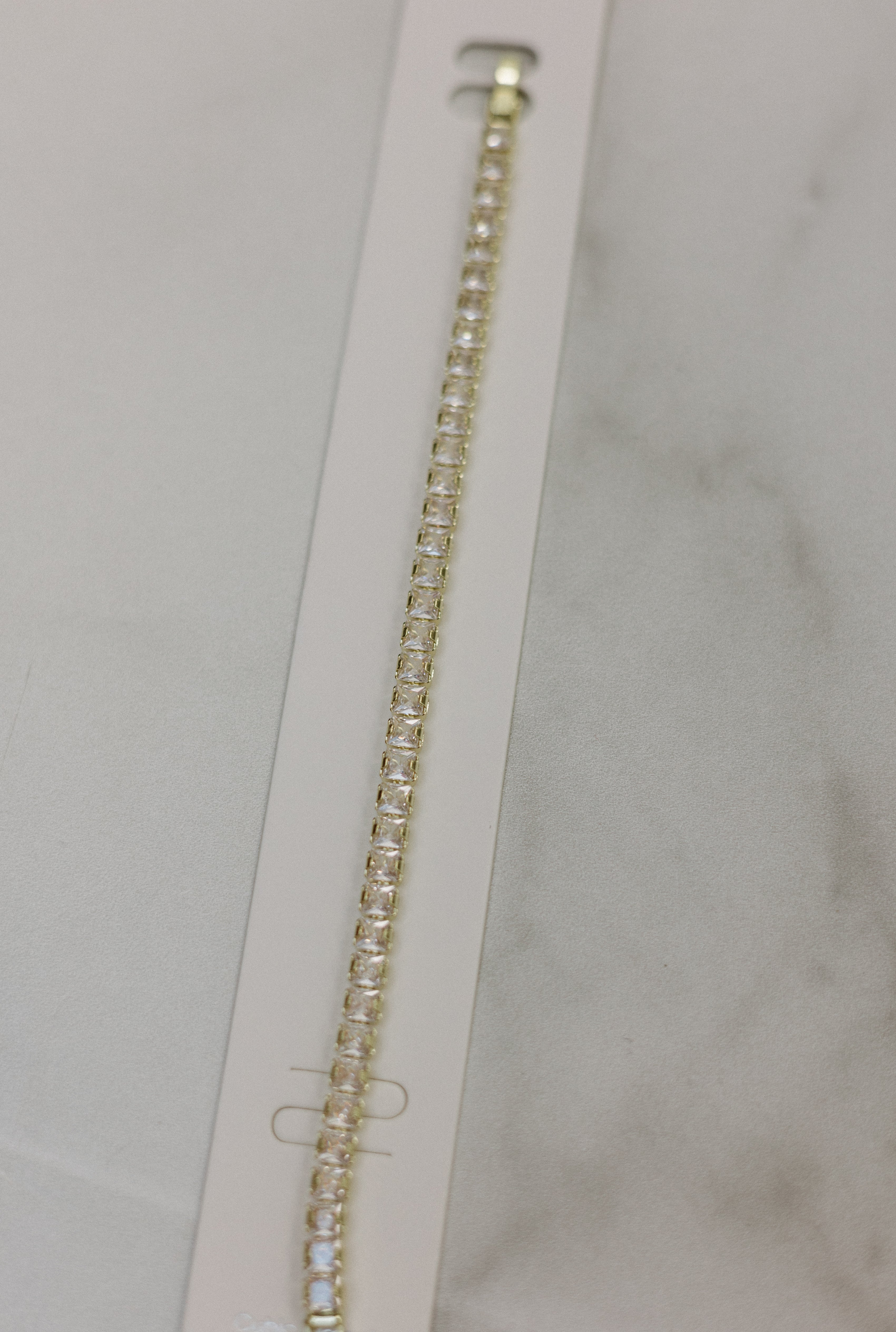 Make a statement with our CZ Tennis Bracelet, featuring a stunning row of sparkling cubic zirconia stones set in a classic design. This elegant and versatile bracelet adds a touch of glamour to any ensemble, perfect for adding a touch of sophistication to your look.