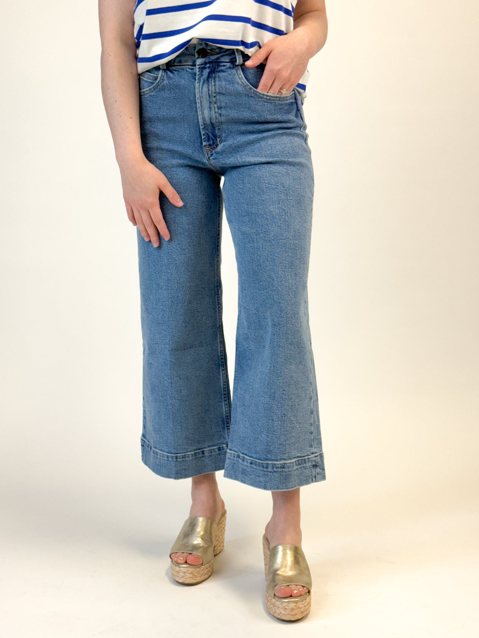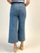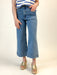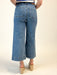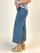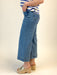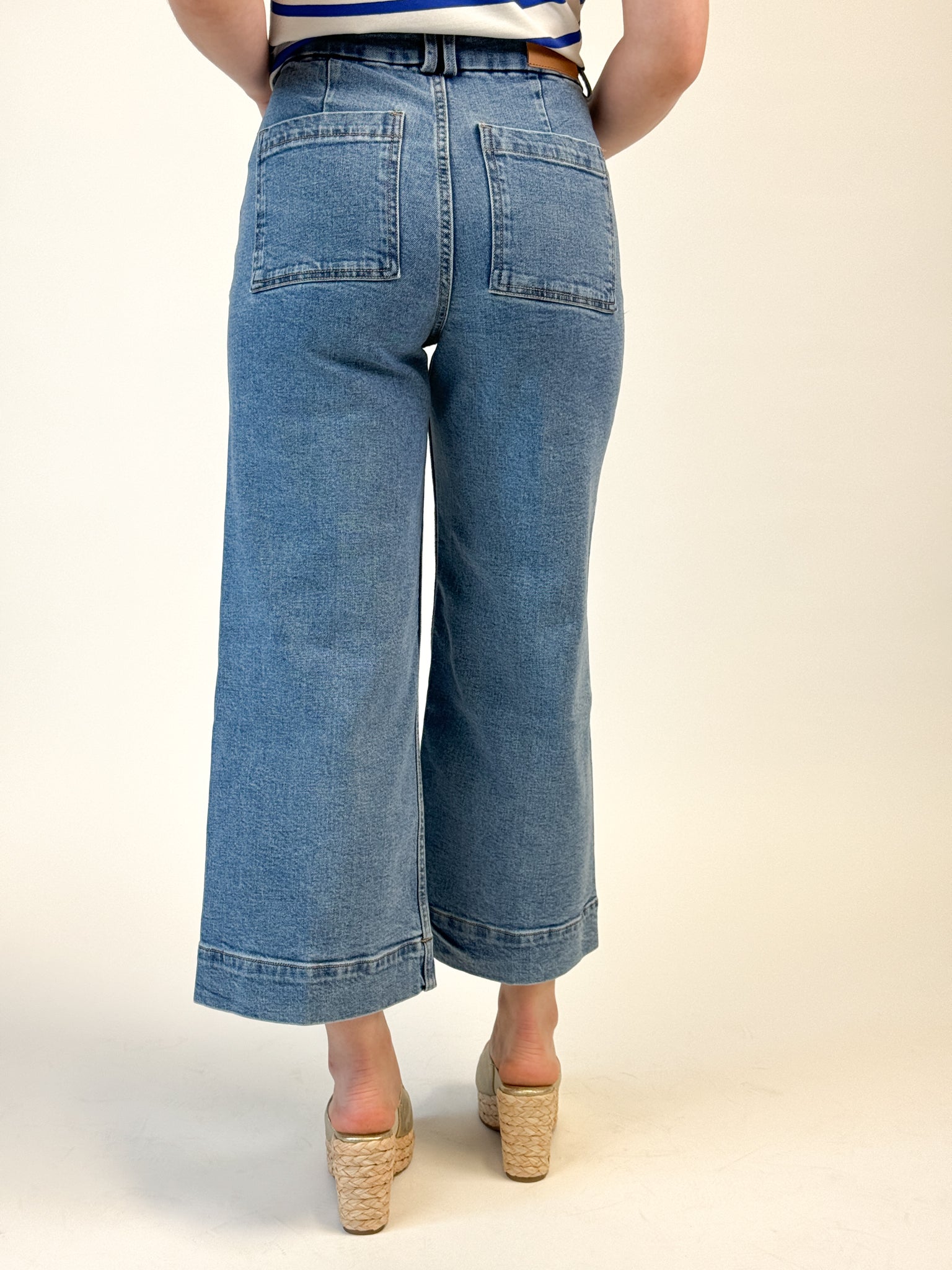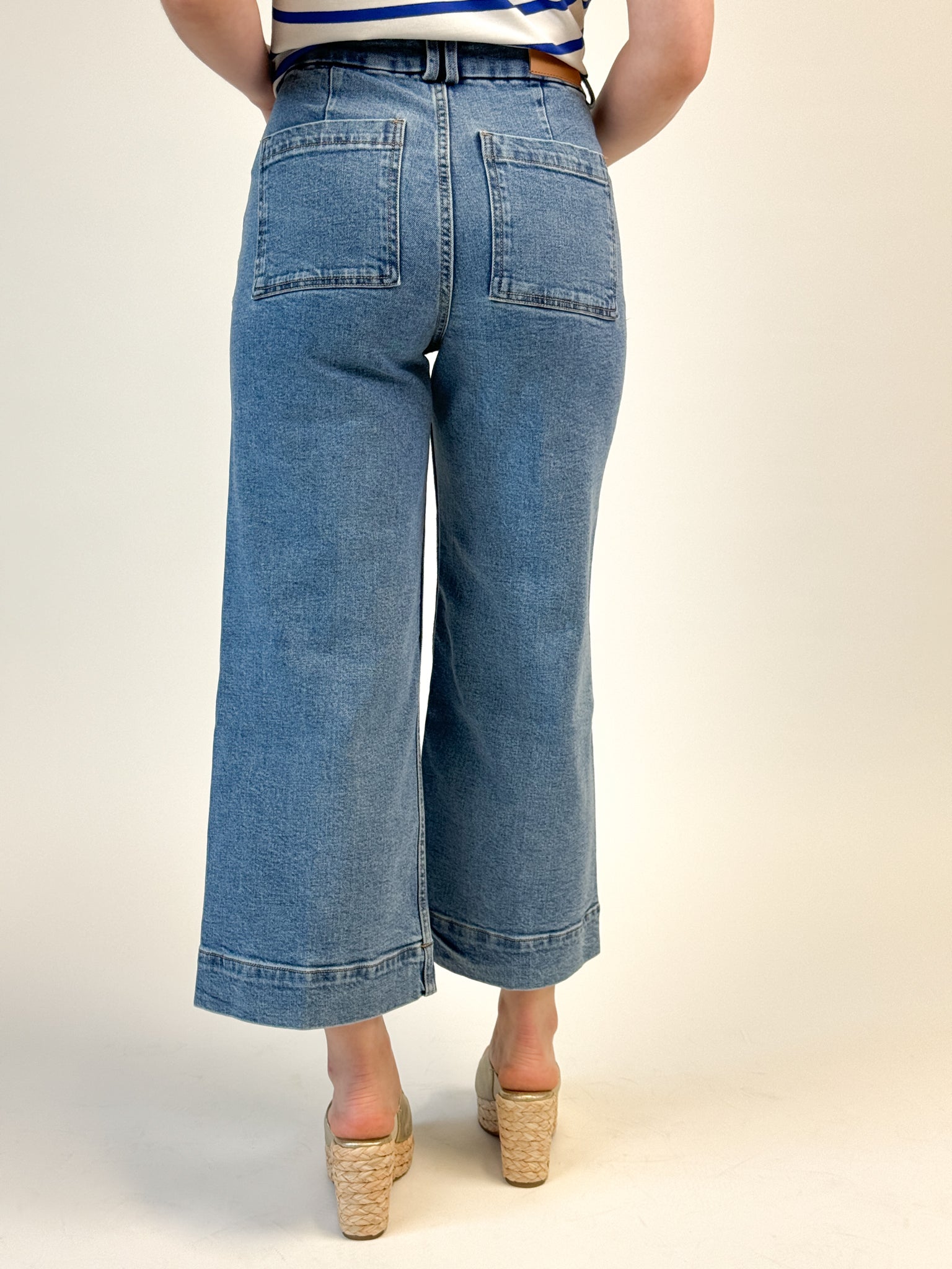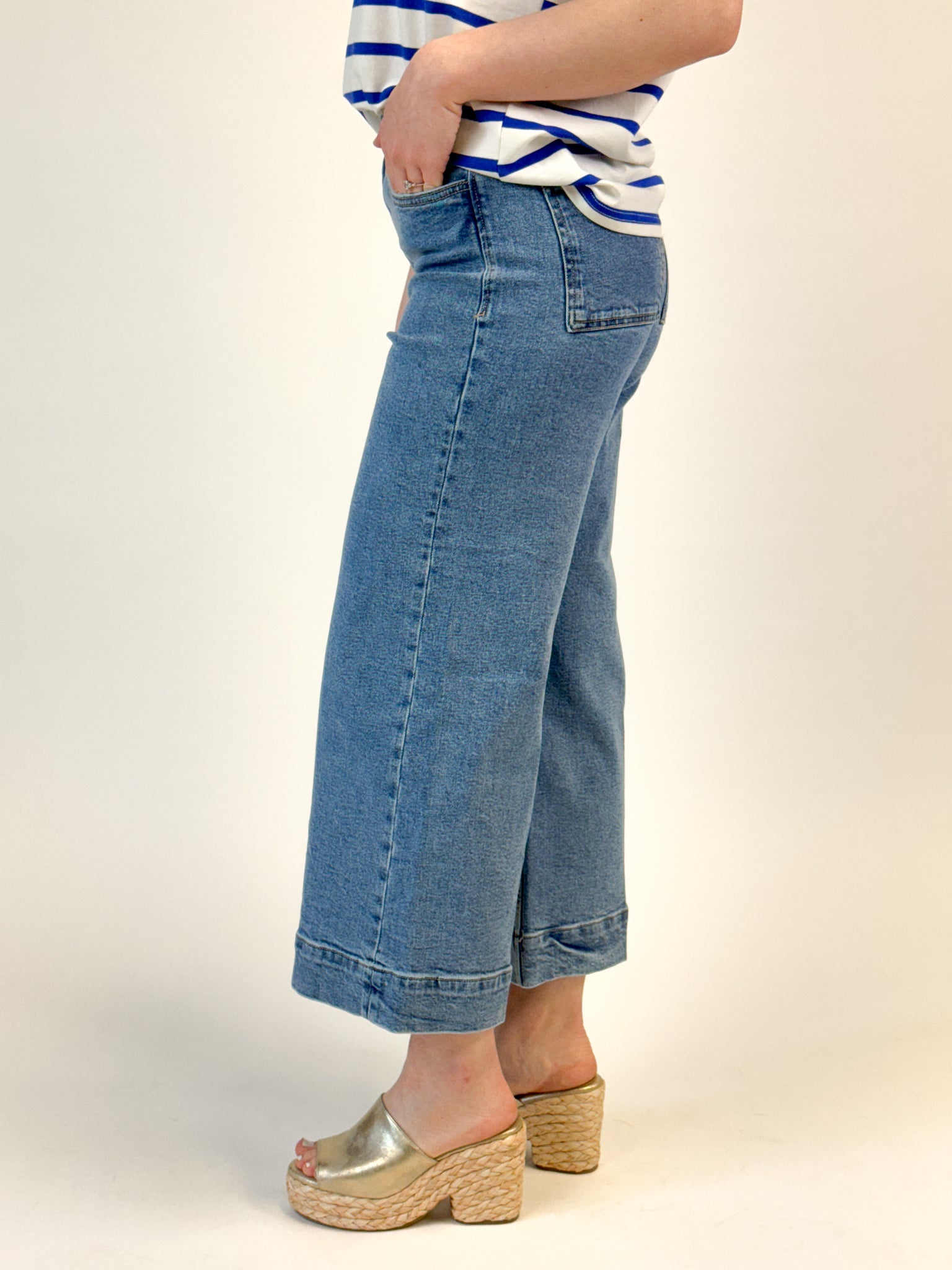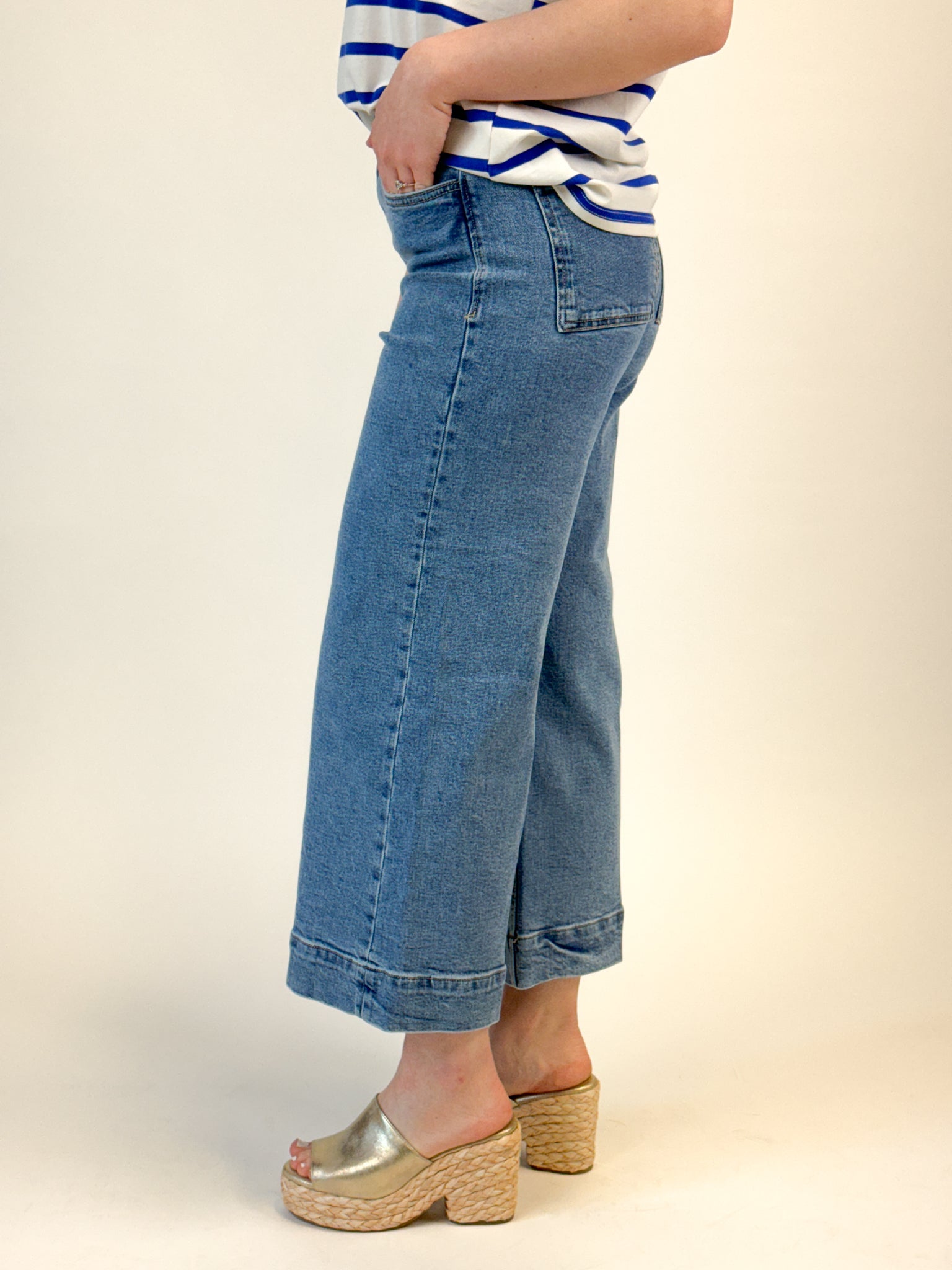 Super high rise cropped wide leg jeans. A statement-making denim wonder, resting at the natural waist and offering a relaxed silhouette in the hip and thigh. Cropped inseam on comfort stretch denim accented with back patch pockets, wide hem opening, back darts for lift support, matching button waistband closure, in a complementary medium shade.