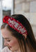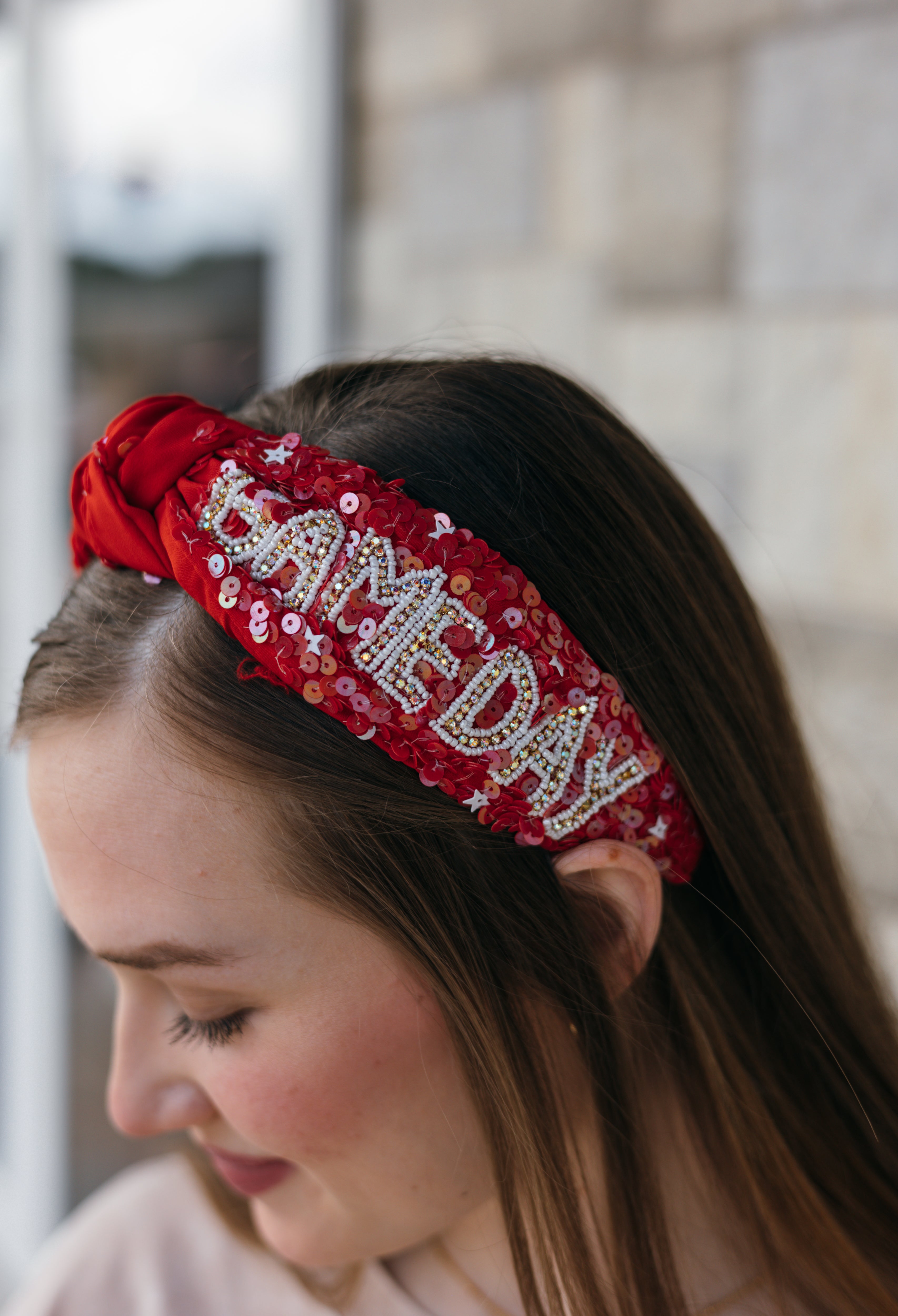 Show off your team's colors with this Gameday embellished headband! It features rhinestones and beading with a top knot accent. A perfect accessory to complete your outfit!