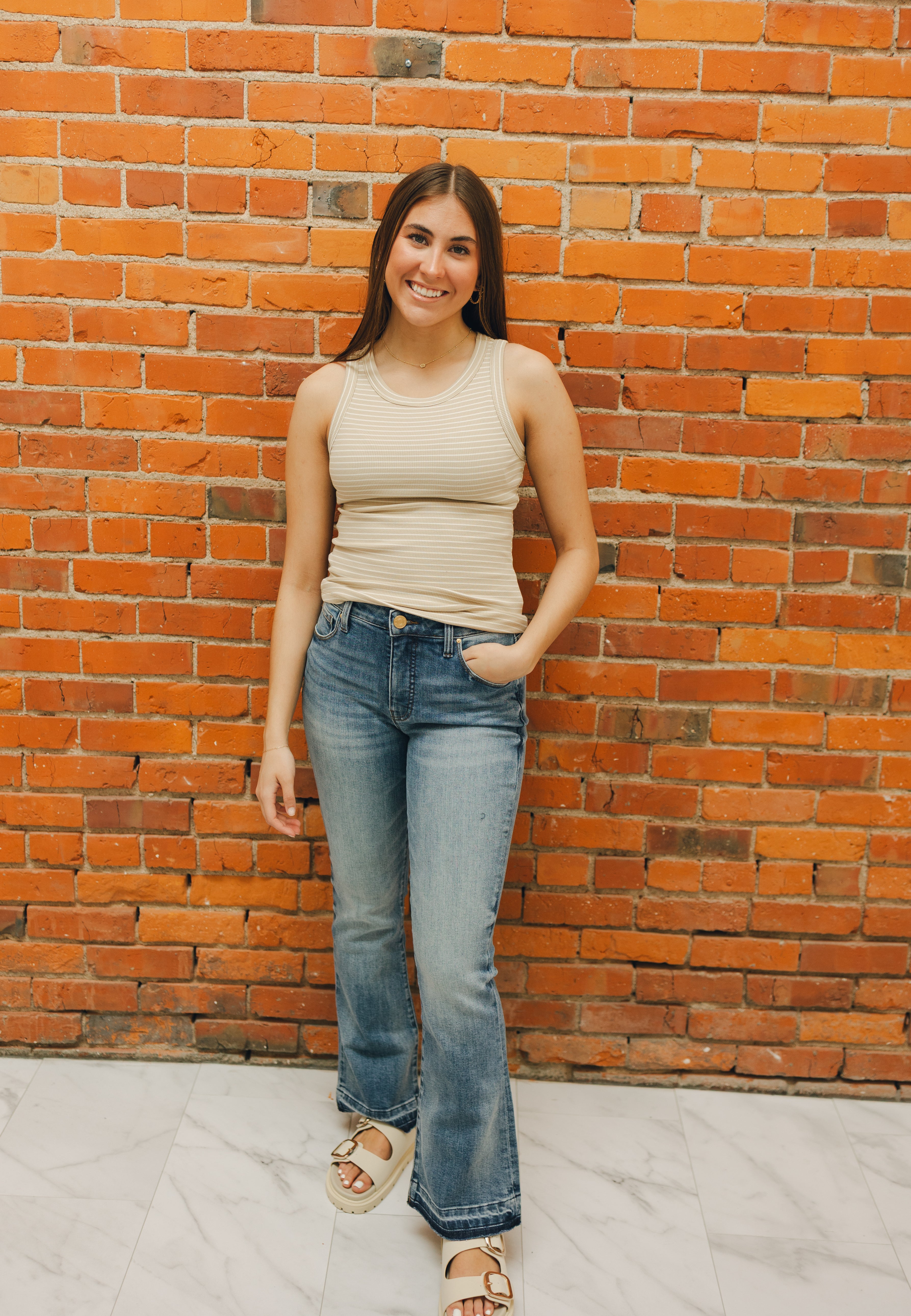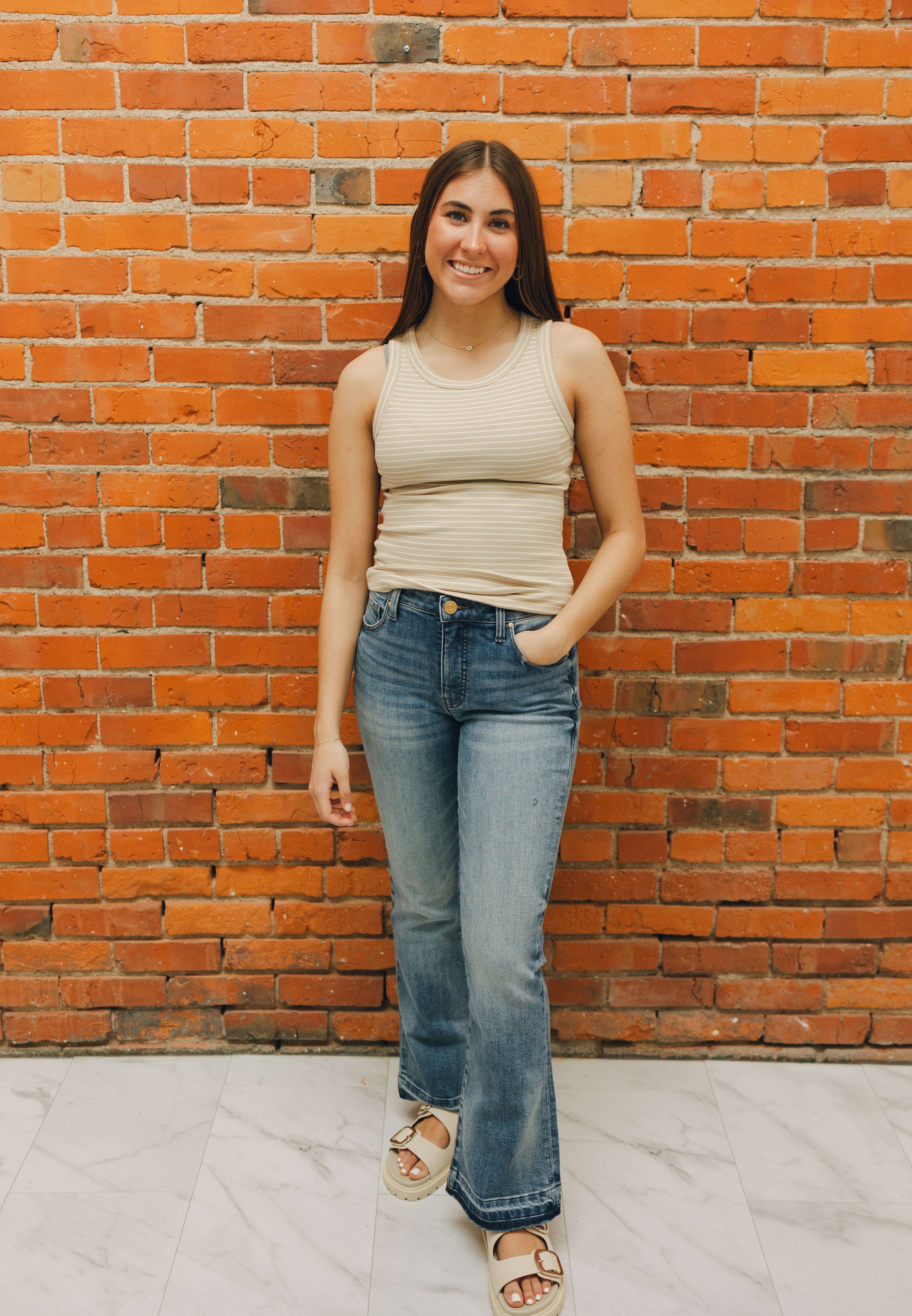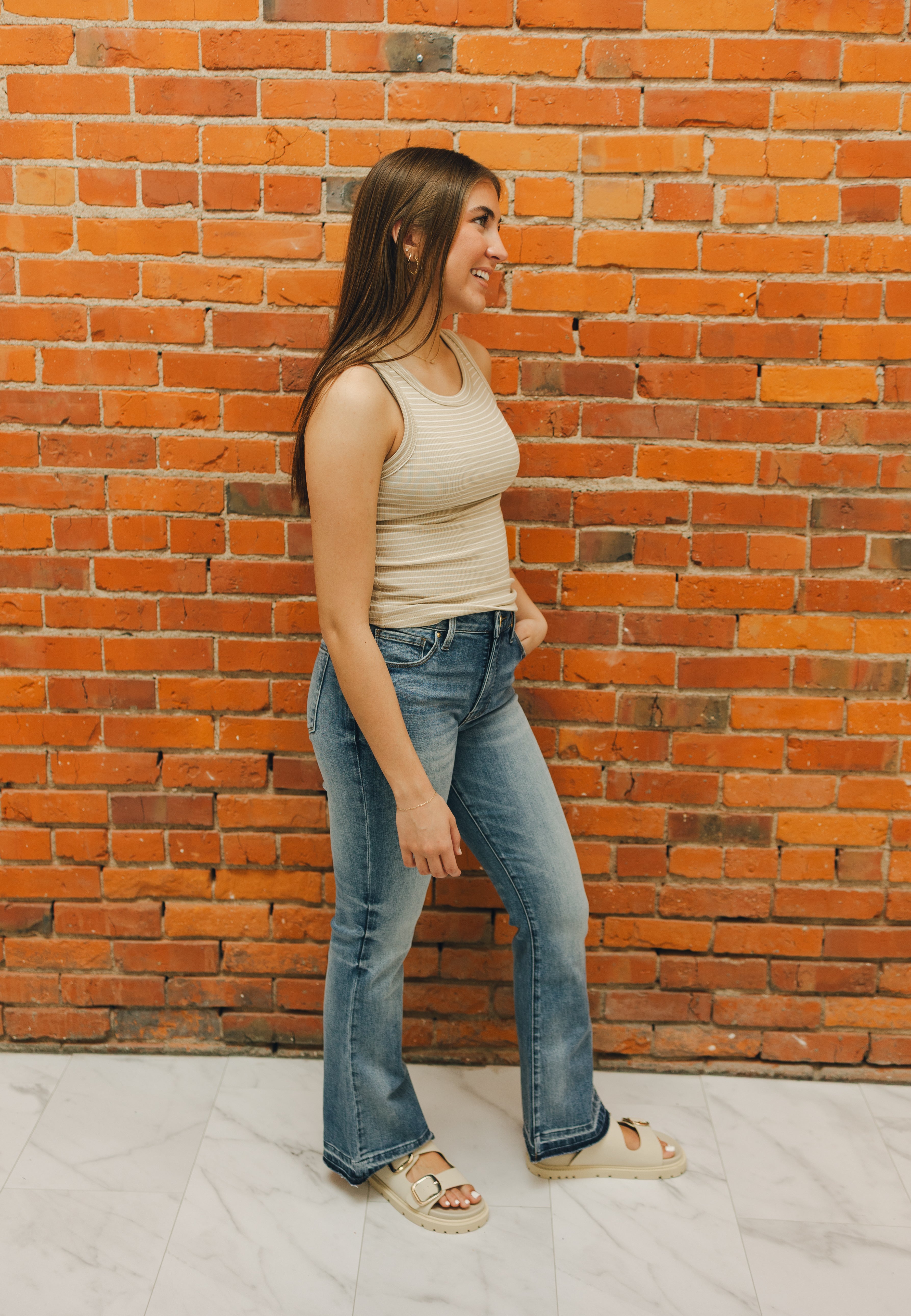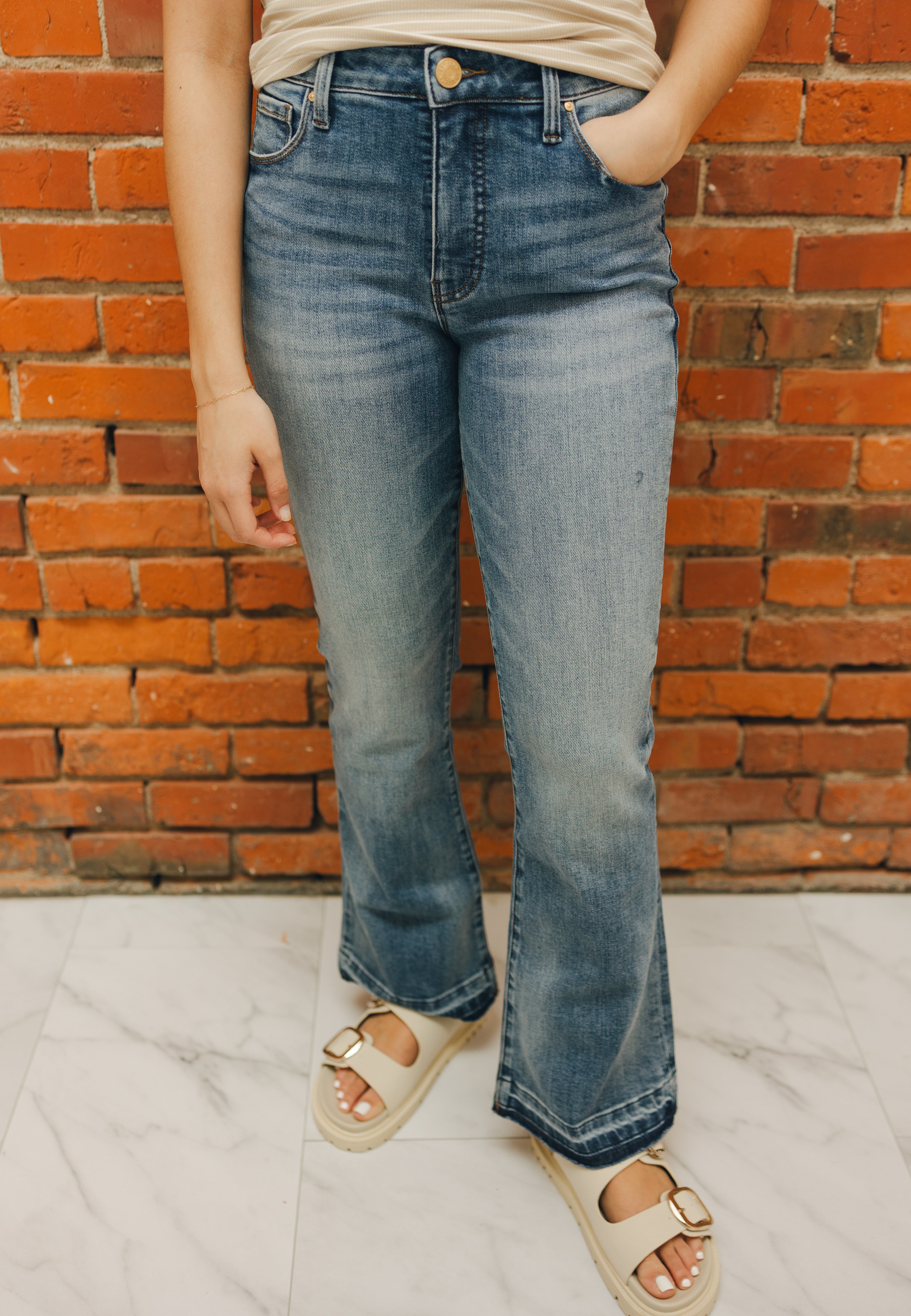These high-rise Fab Ab flare jeans feature a flattering fit with a chic released hem, offering a stylish and comfortable look. Perfect for adding a touch of flare to your wardrobe.