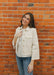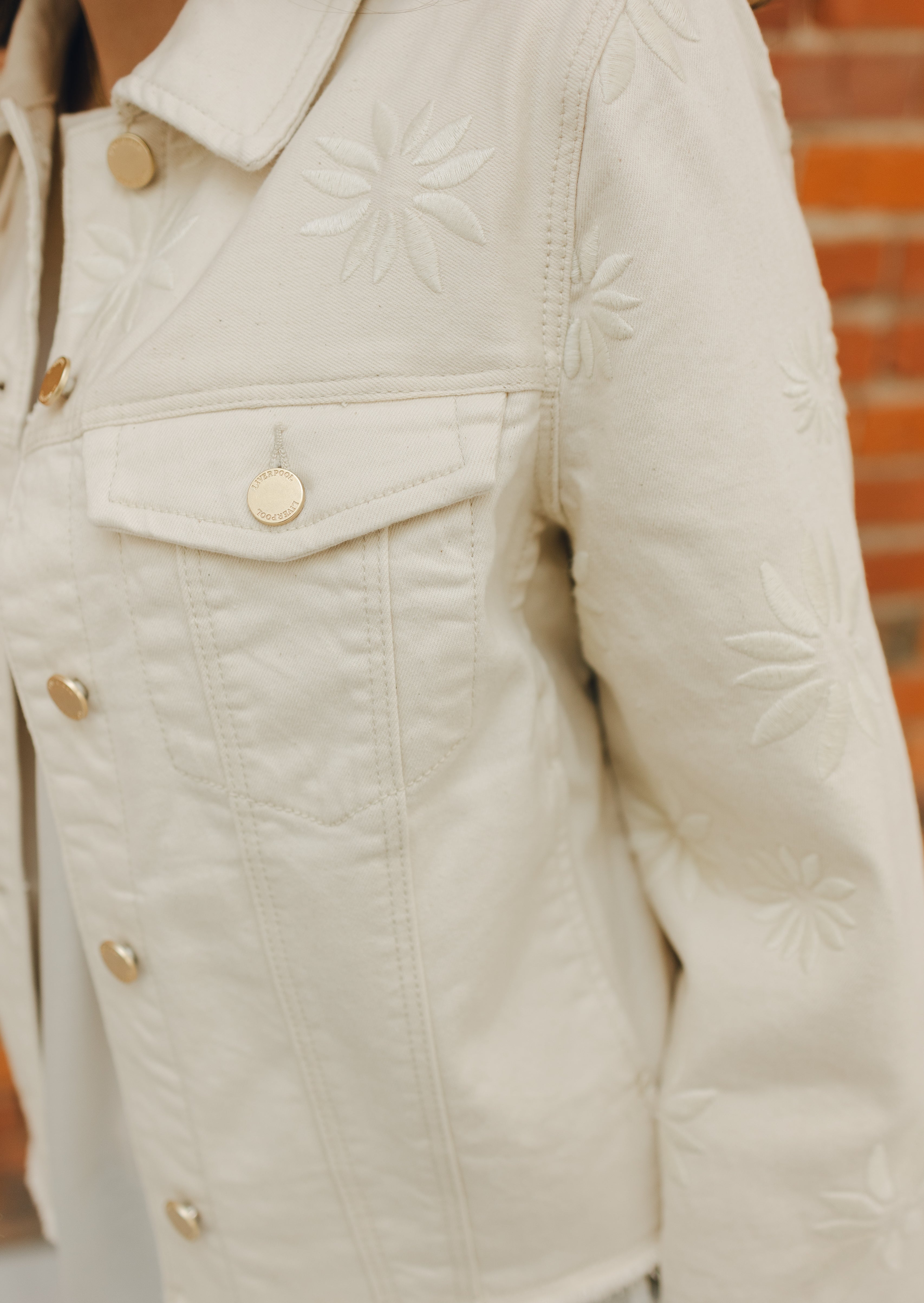 This versatile jacket features stunning floral embroidery details for a fashionable touch. Crafted with a neutral ecru wash, it effortlessly complements any outfit.
