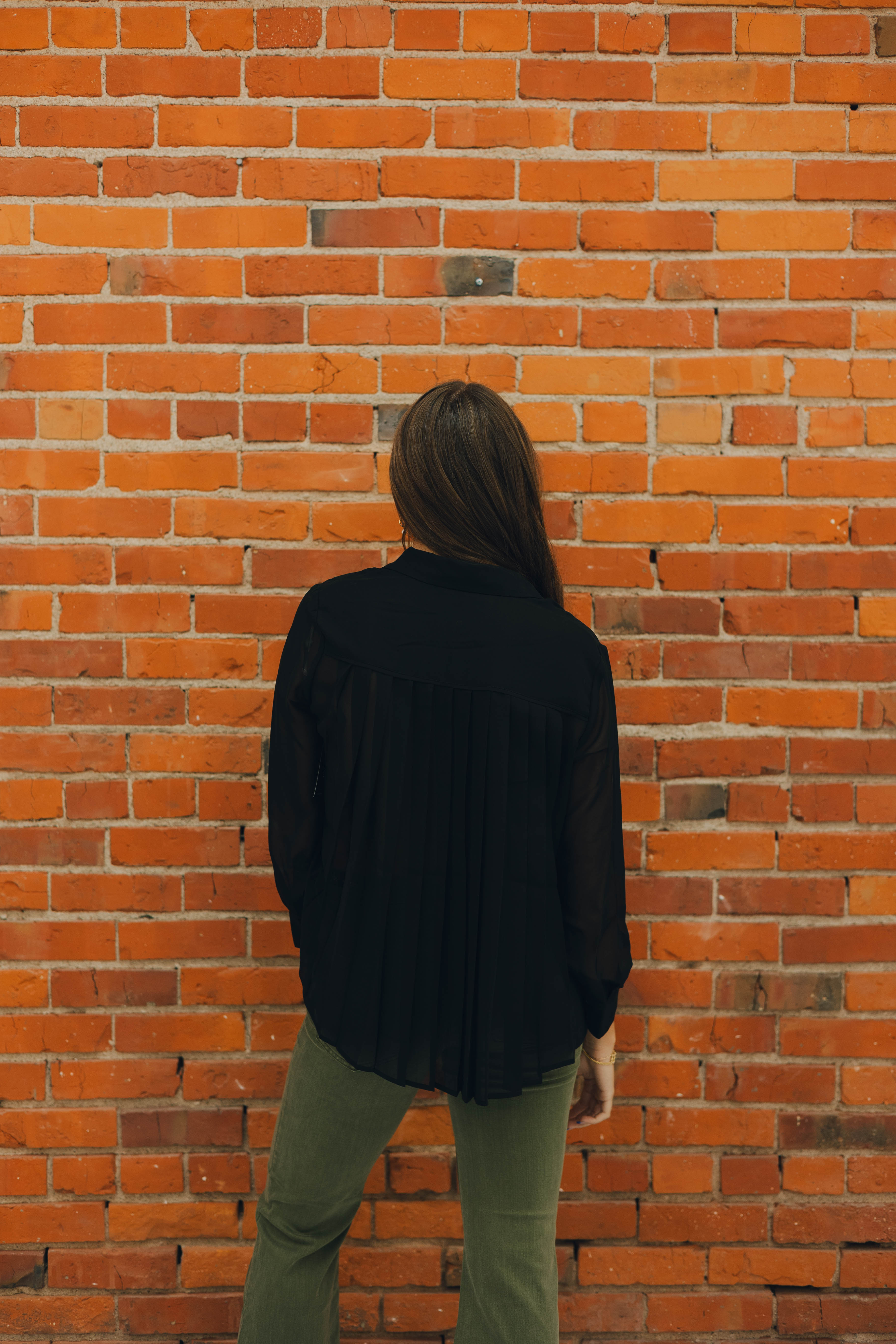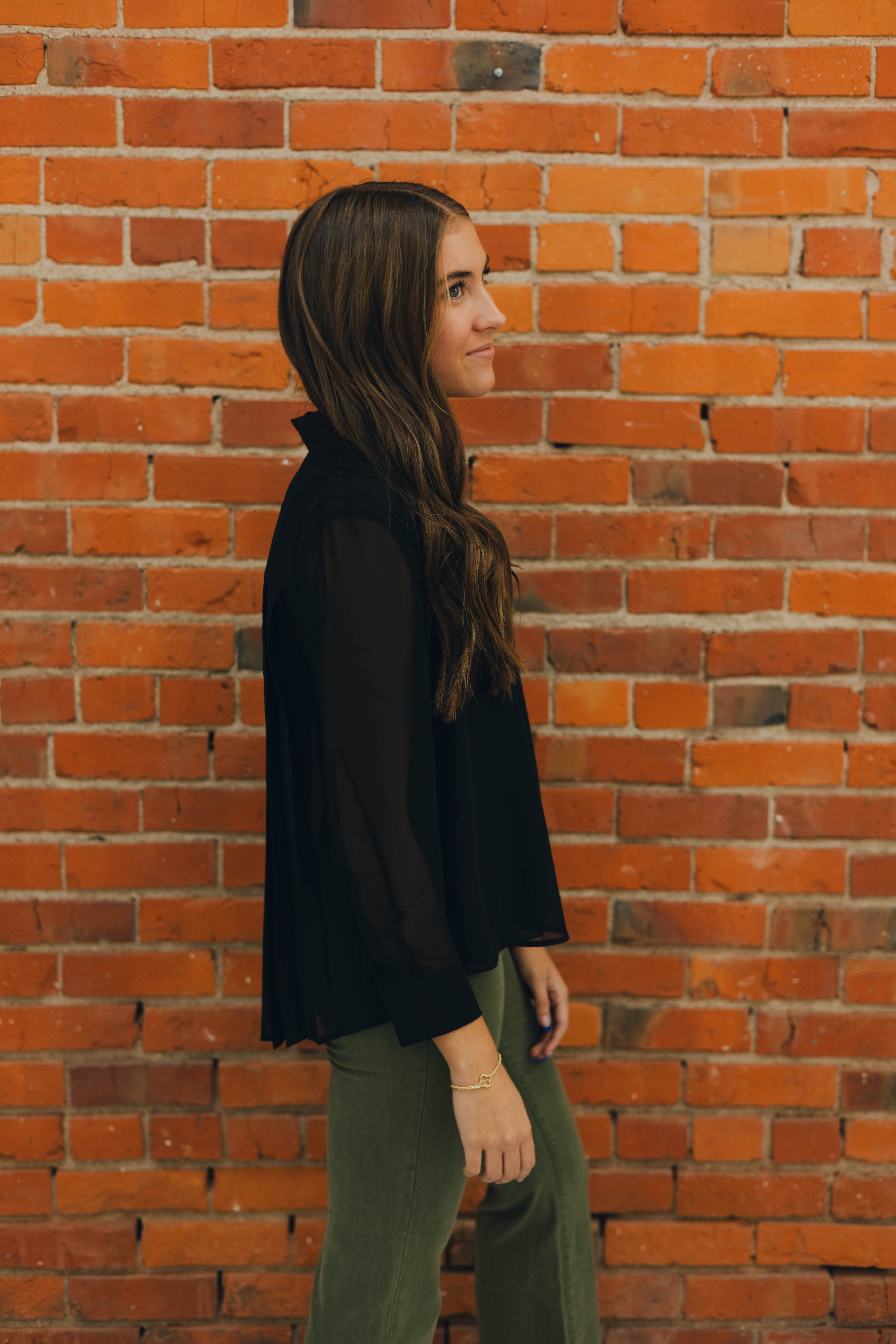 Our chiffon button front blouse can be dressed up or down effortlessly. Back pleat details elevate this statement piece making it your new favorite fall wardrobe staple.