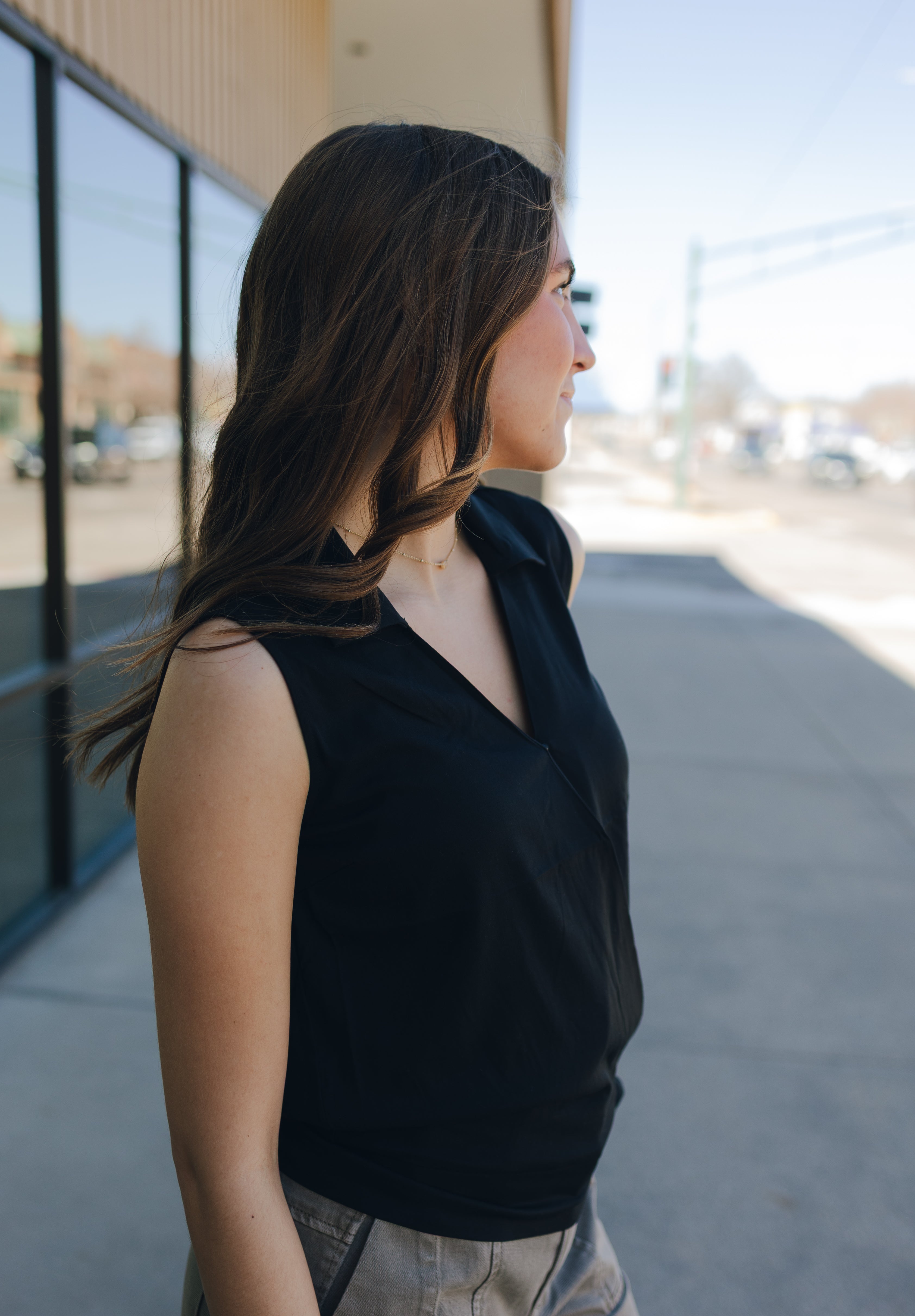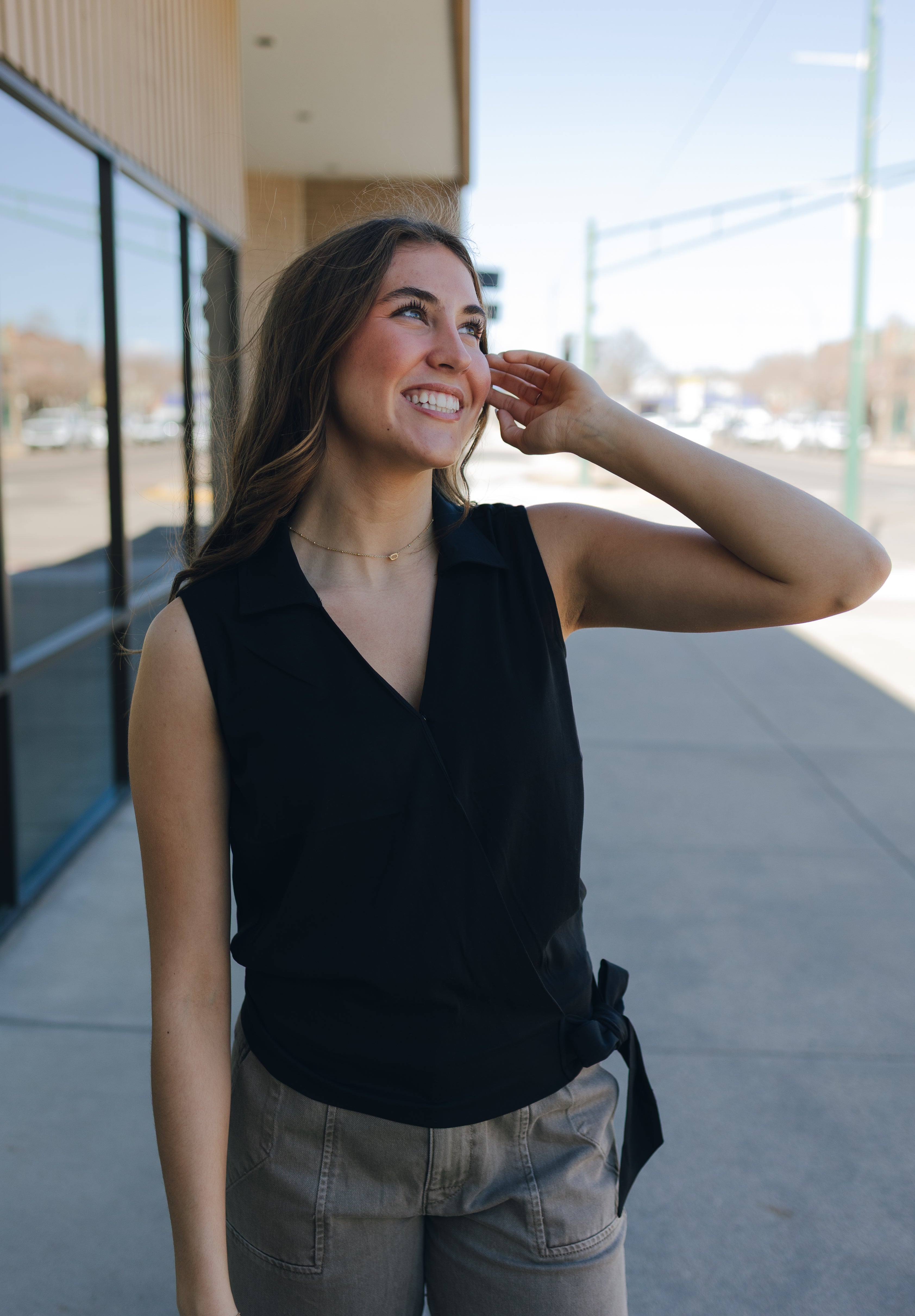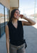 A stunning, sleeveless surplice top with a self-tie closure that offers versatility in styling. Perfect for pairing with denim or the matching bottoms to achieve an effortlessly elevated look.