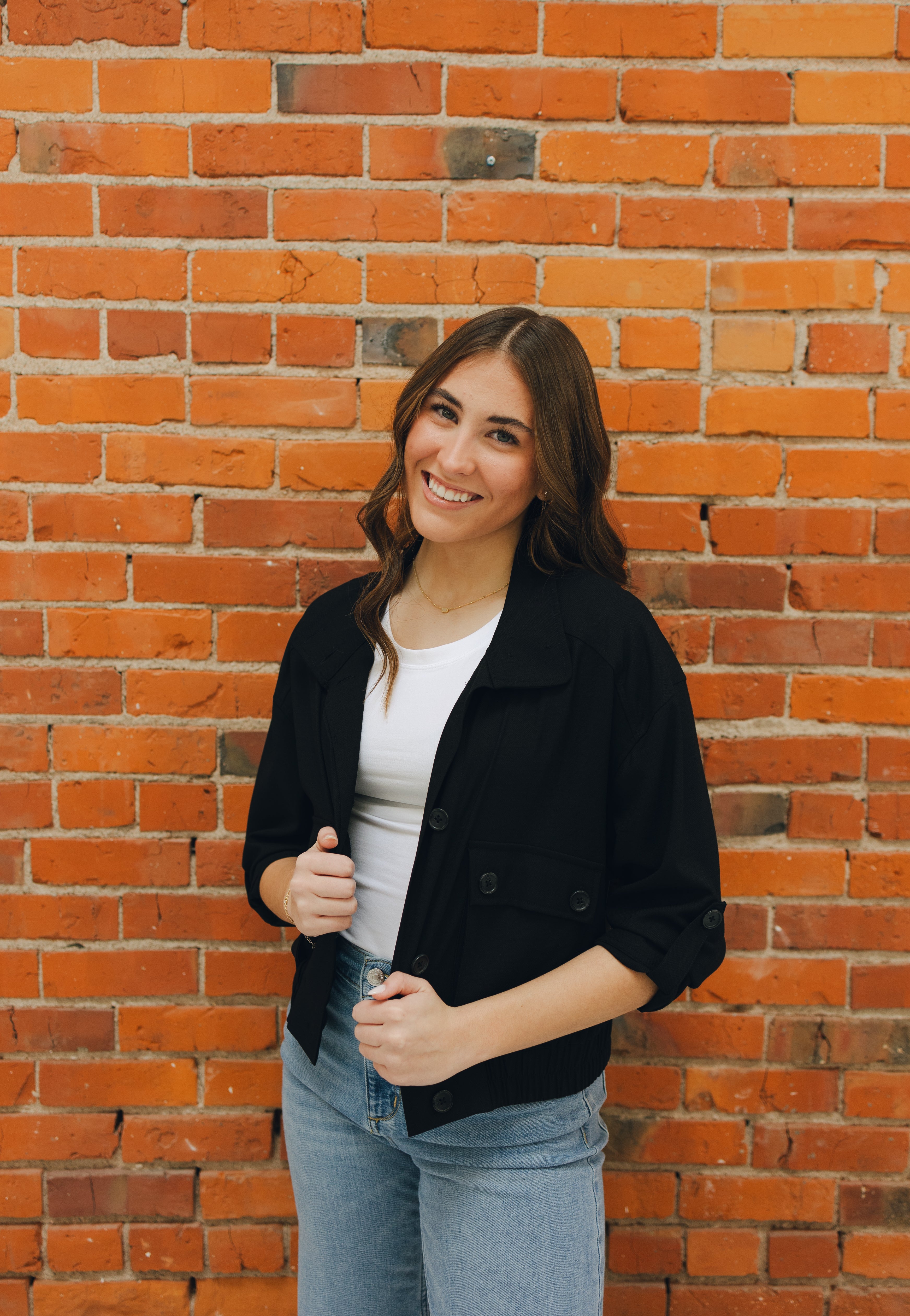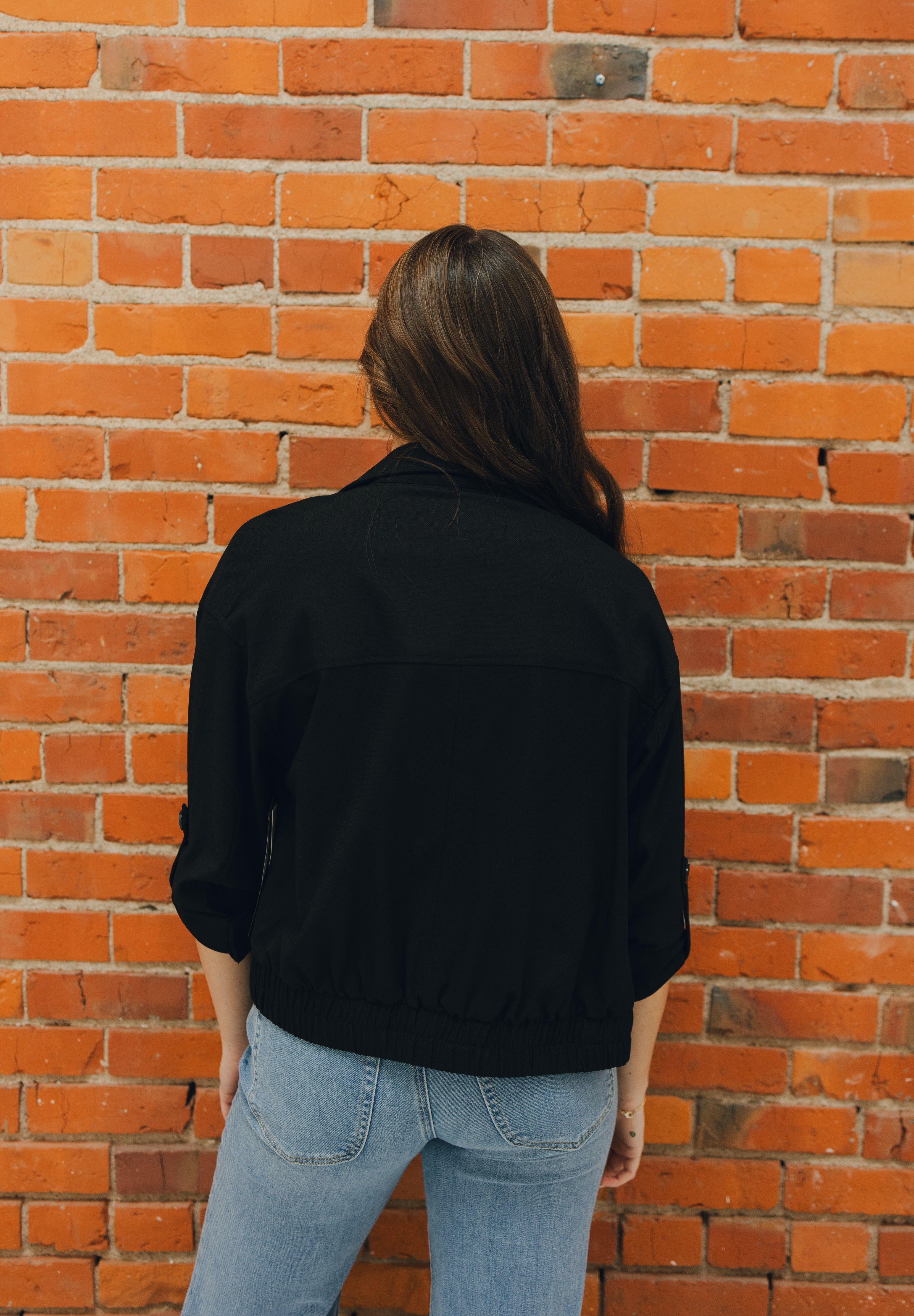 This cropped utility jacket features a cinched hem and is made in our amazing textured stretch woven fabric to provide remarkable elasticity while maintaining a stylish and edgy look. It delivers stylish versatility with ease.