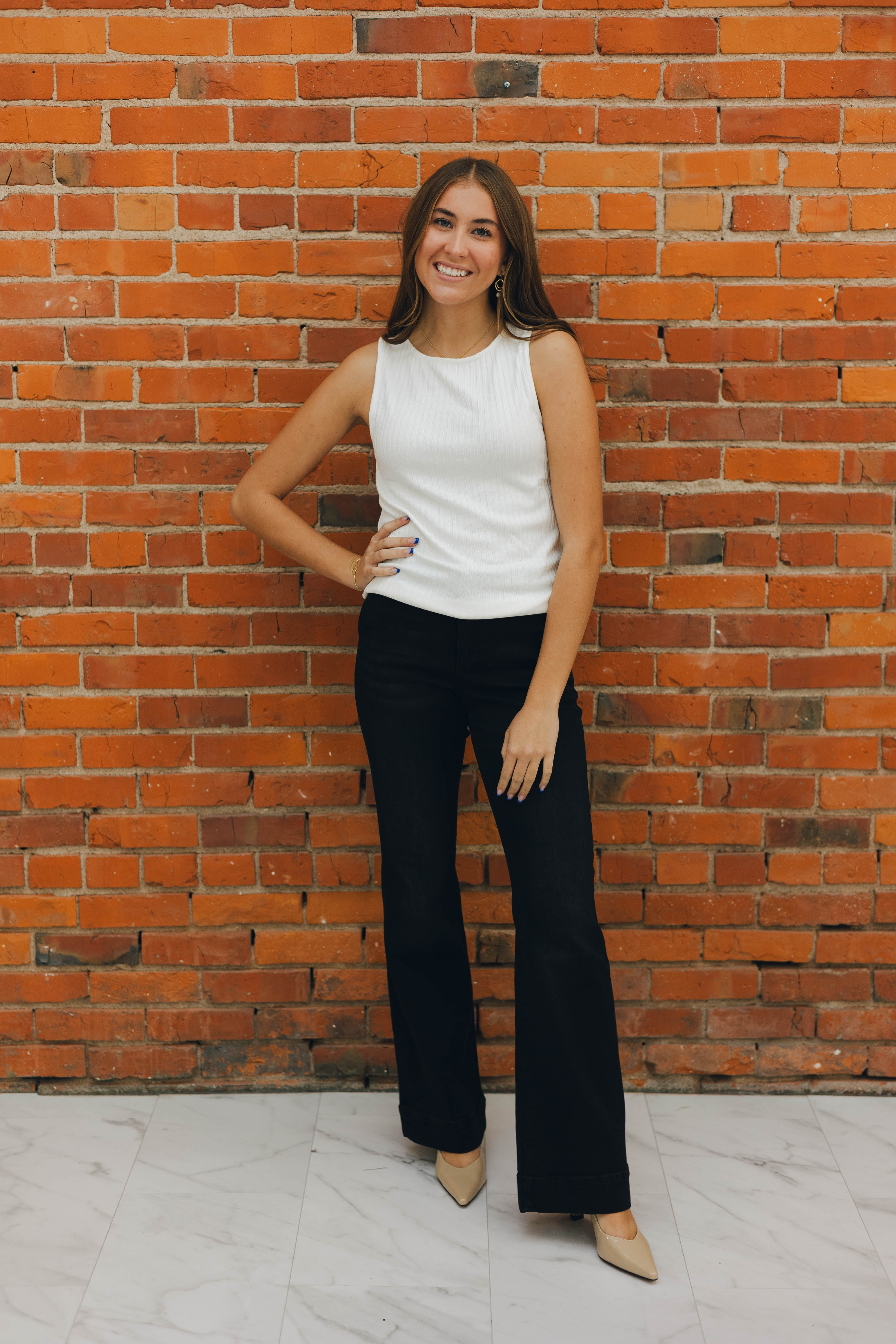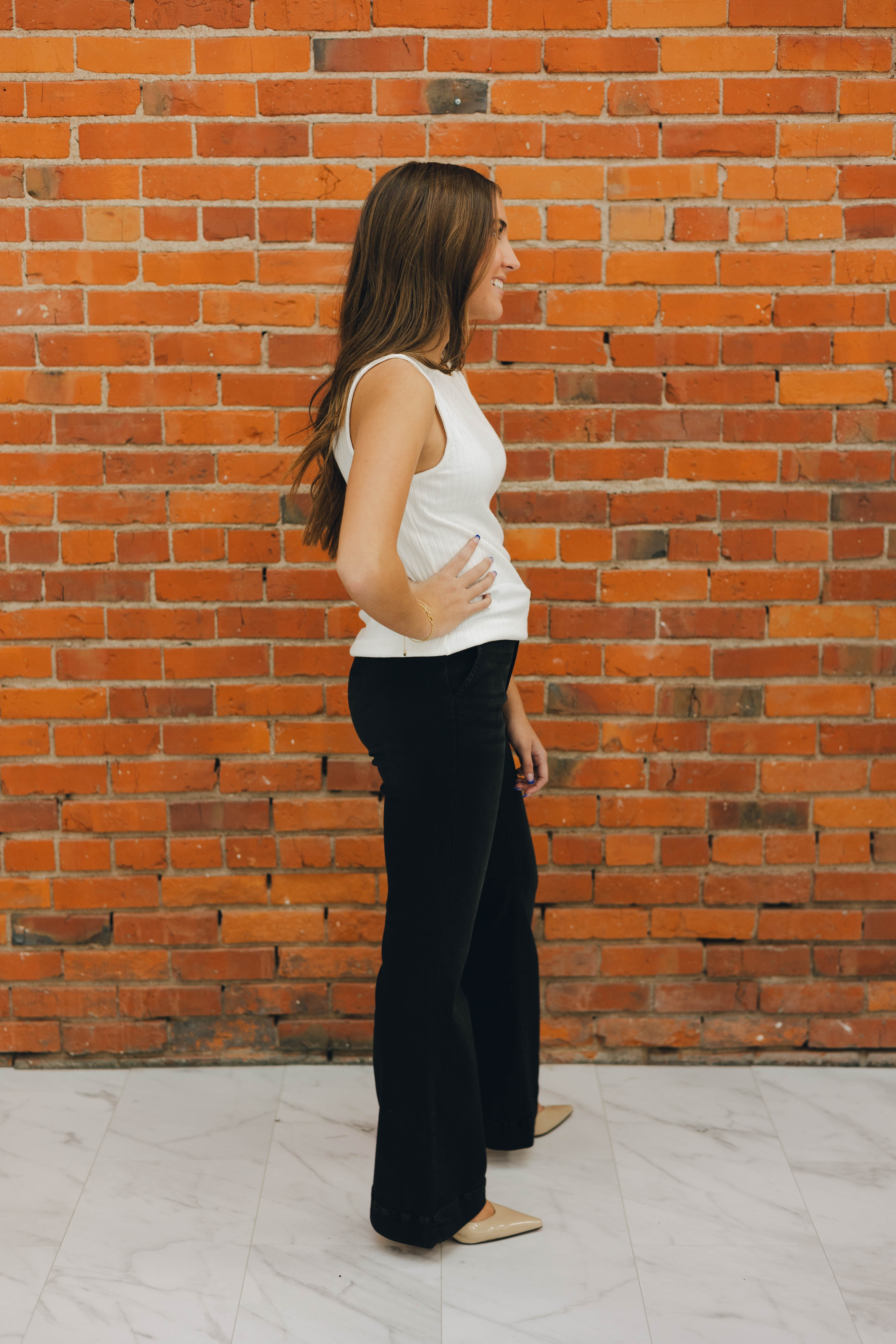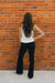 These denim trousers are designed with a wide waistband to enhance comfort and style. Crafted from rich, dark denim, these offer a sleek, polished look. Perfect for versatile styling, discover timeless sophistication with every wear.