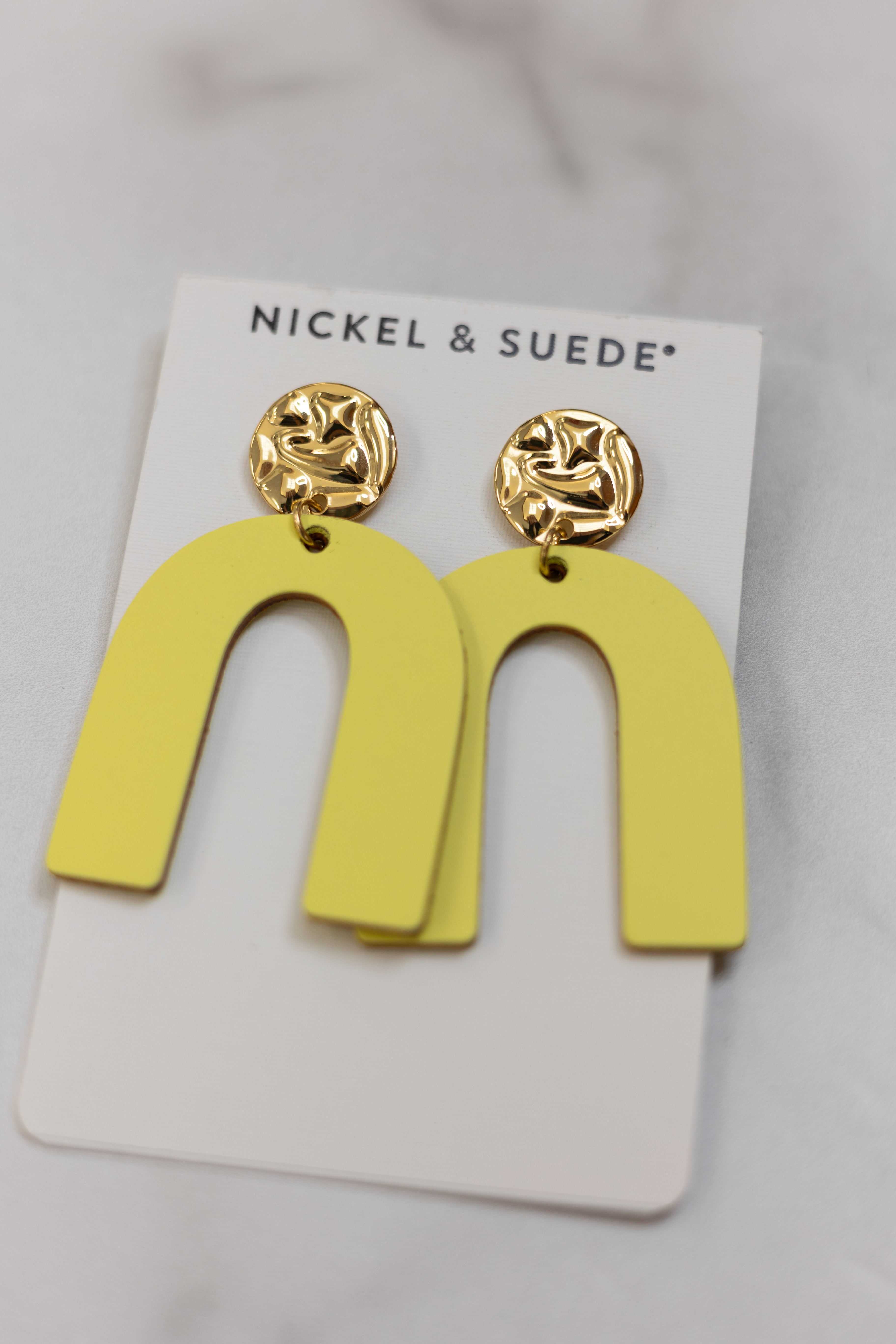 Beaus are lightweight statement earrings inspired by organic shapes. These leather earrings are available in bright citron yellow leather on sterling silver ear posts.