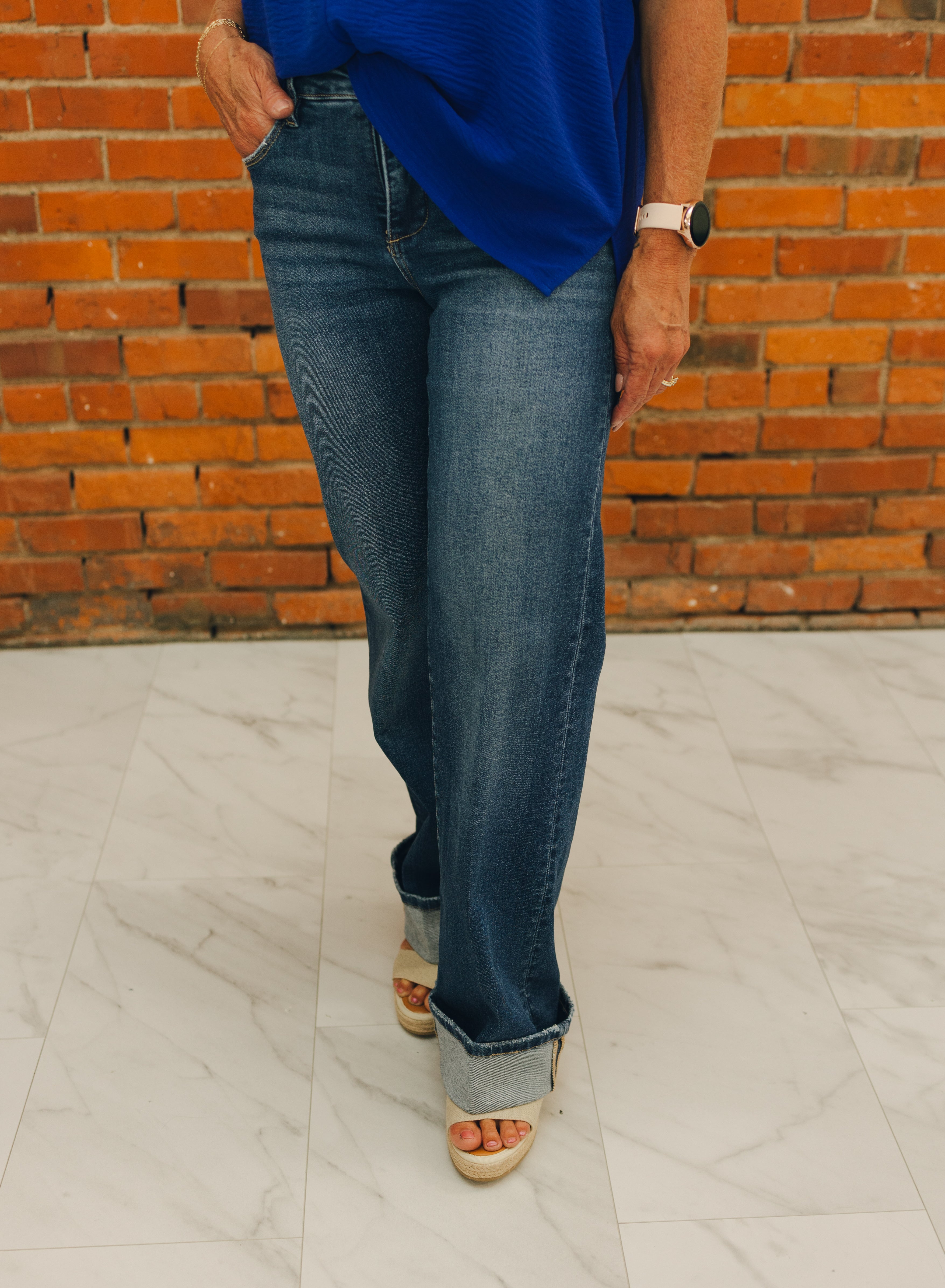 Your new go-to jeans for everyday style with a little flair! These Risen Mid Rise Cuffed Wide Jeans feature a relaxed, wide-leg fit and a flattering mid-rise waist that sits just right. The cuffed hem adds a playful touch, making them easy to dress up with heels or keep casual with sneakers. Designed with soft stretch denim for comfort and ease of movement—these jeans will become your new closet staple.