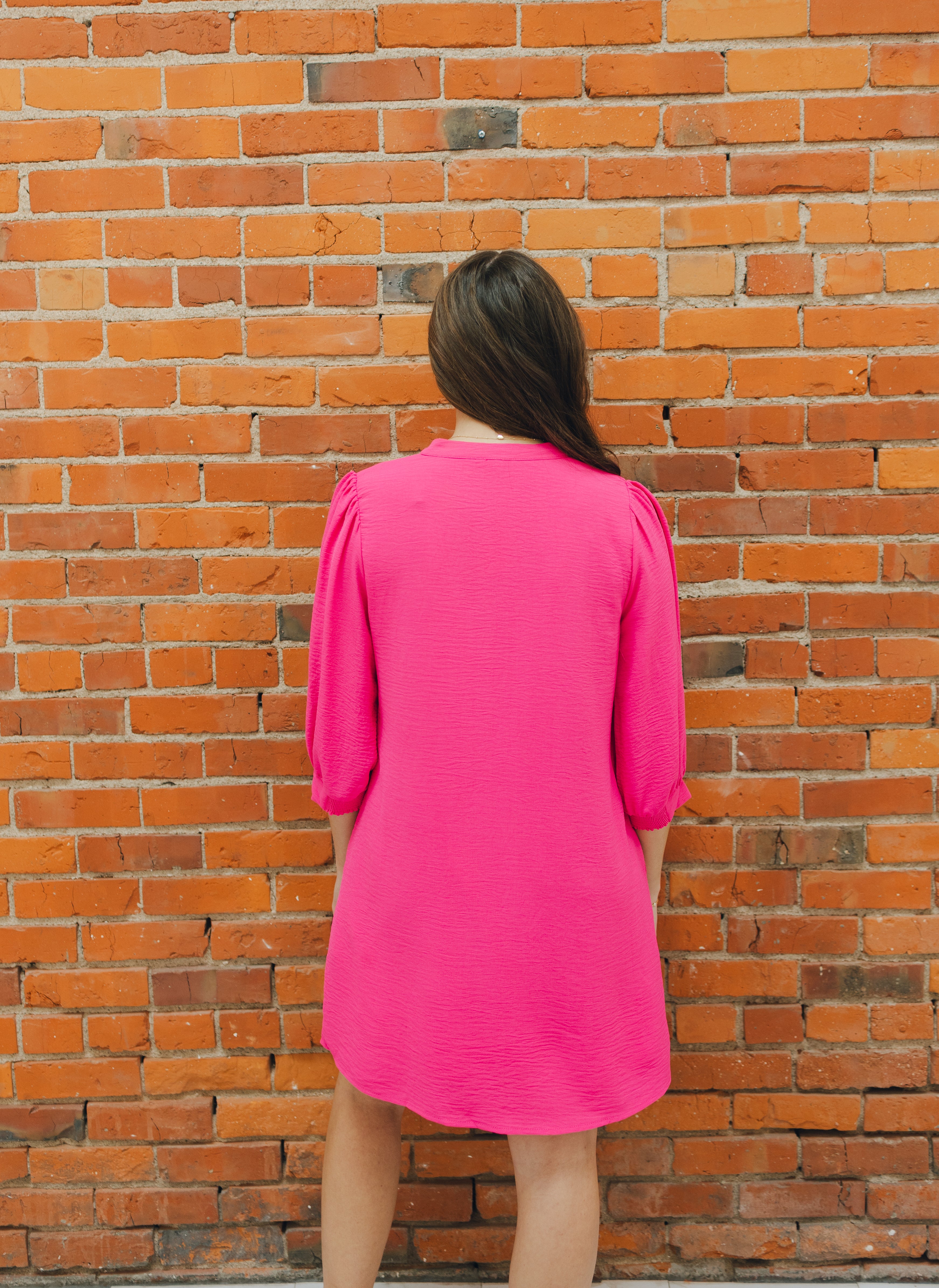Expertly crafted with a solid color and peasant sleeves, this dress exudes elegance and sophistication. The 3/4 length sleeves provide coverage while remaining breathable, making it perfect for any occasion. Elevate your wardrobe with this timeless piece.