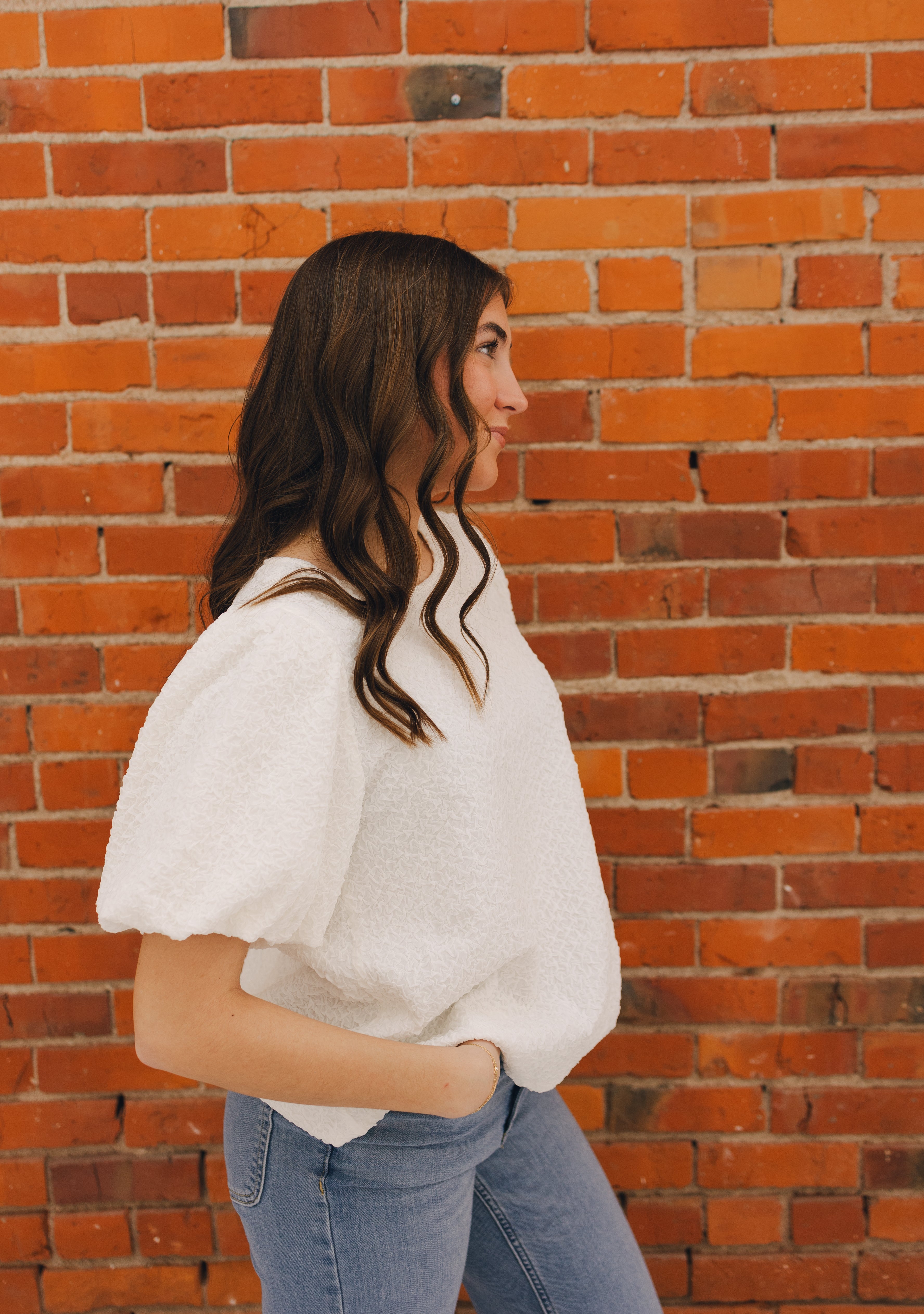 The Solid Off-White Top with Puffed Sleeves is the perfect top for the season. It features simple yet trendy puffed sleeves. Perfect for any occasion, this top will add a touch of sophistication to your wardrobe!