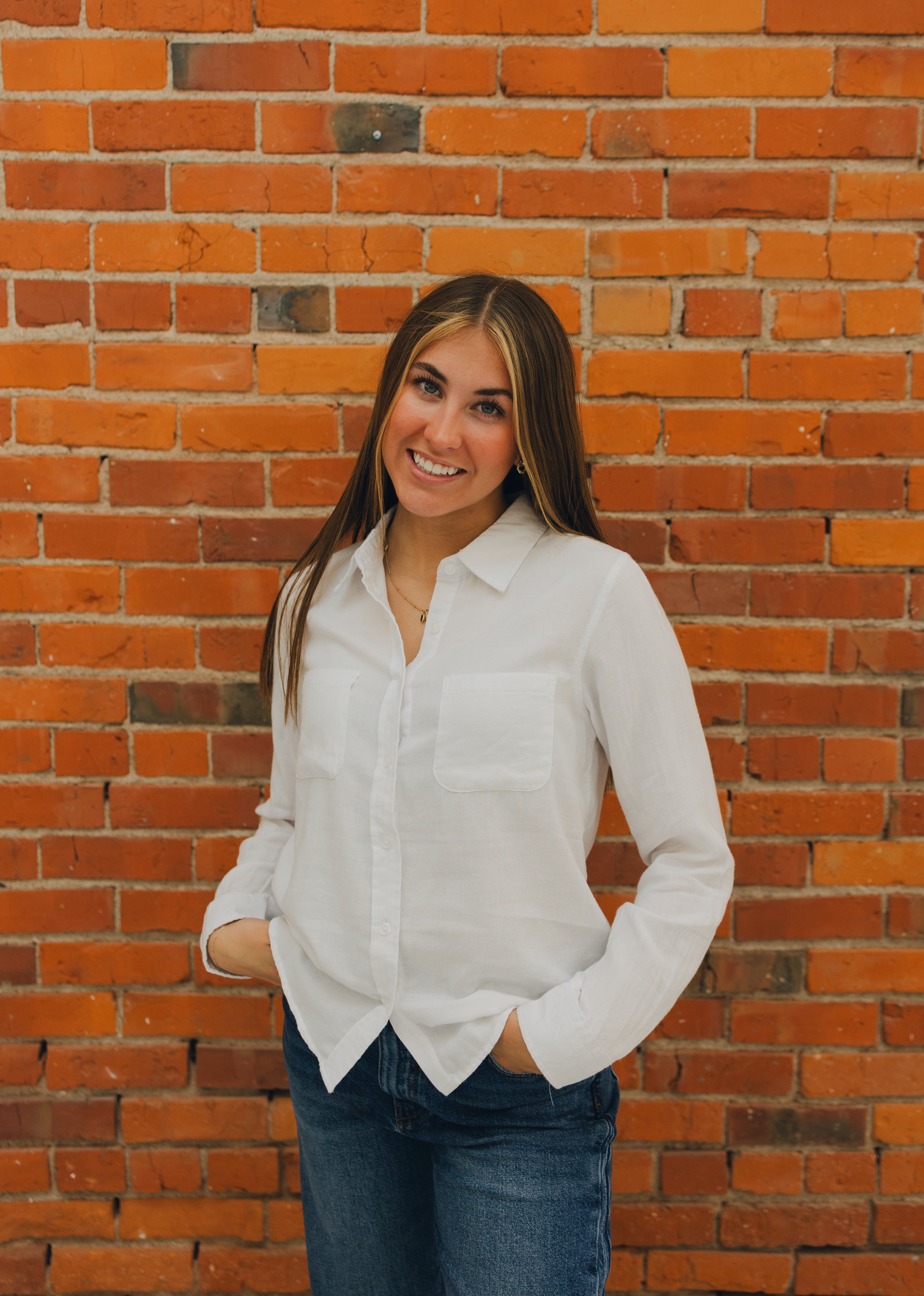 Effortlessly cool, this crisp button up is perfect for any wardrobe, featuring dual front chest pockets and shirt tail hem.