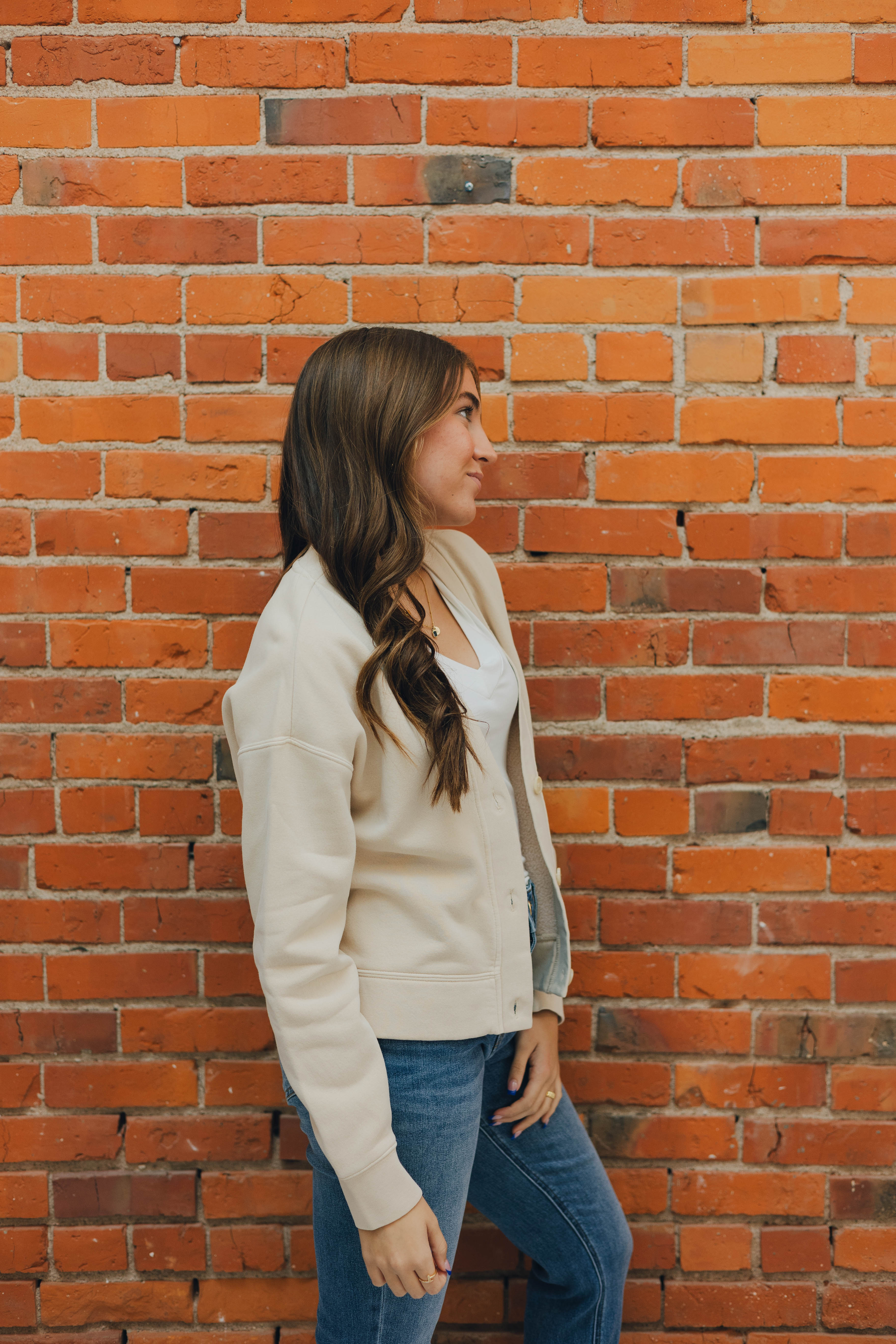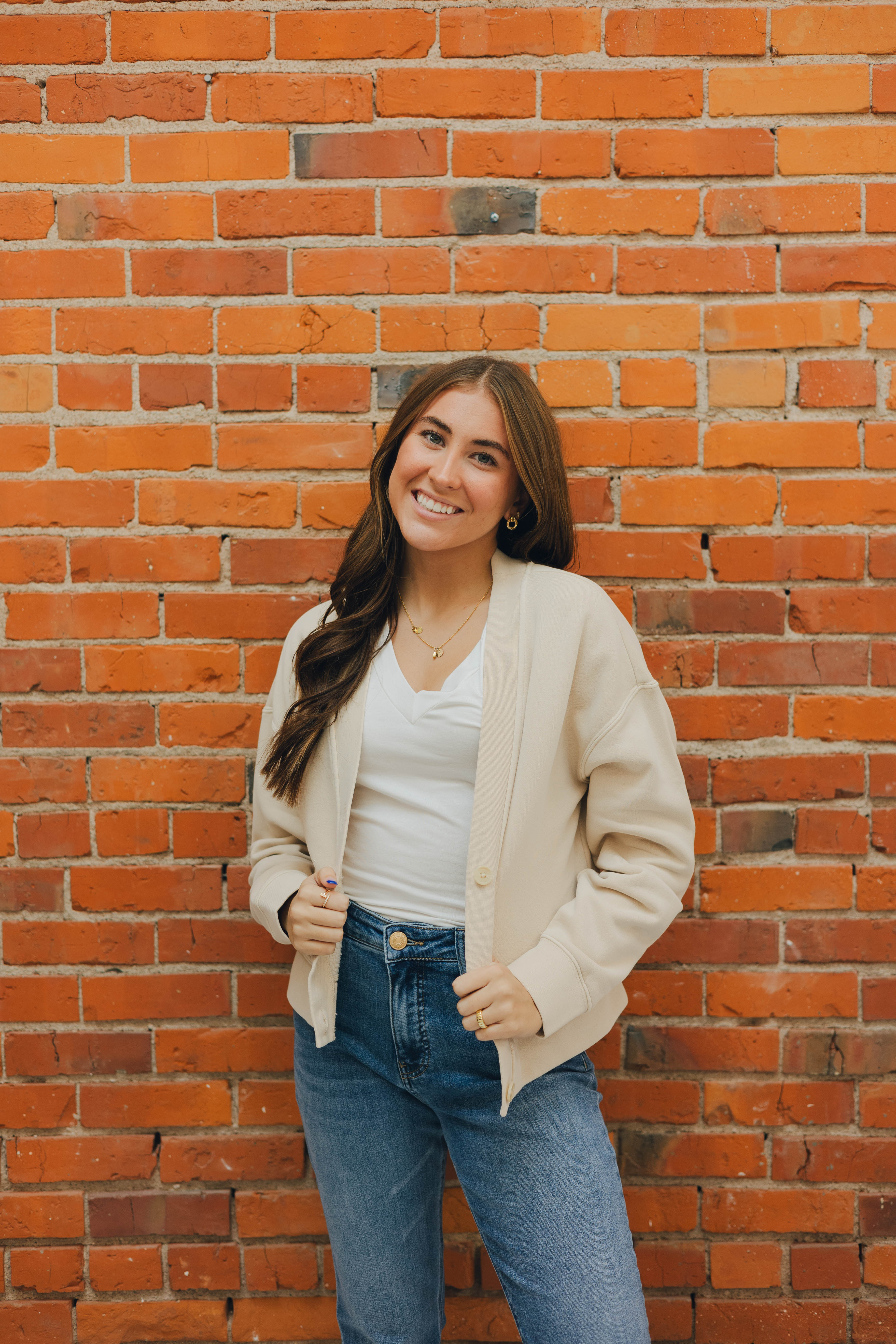 So cool and classic, this cardi is featured in a soft knit fabrication and slouchy silhouette with button-front closures and ribbed hems.