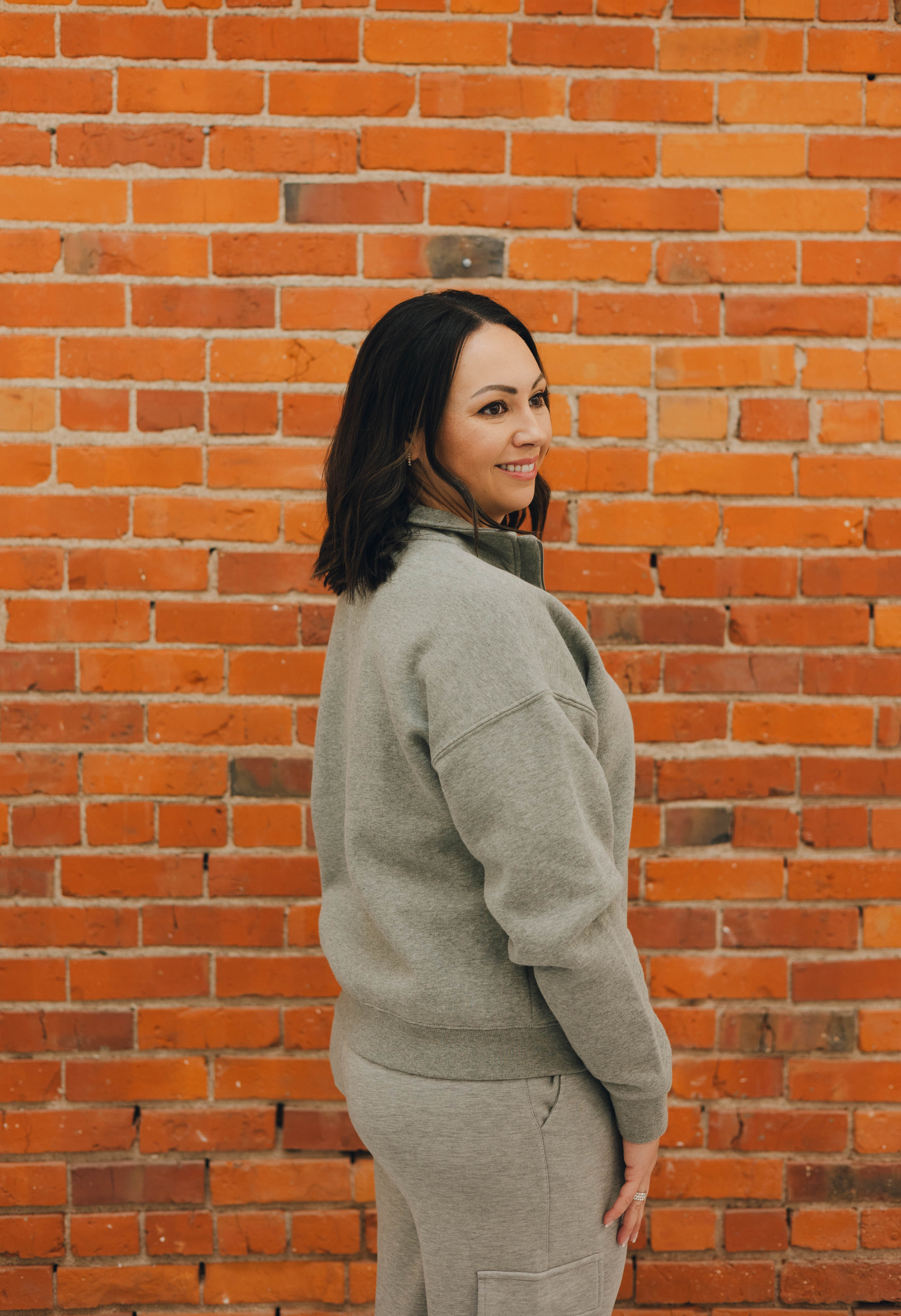 So essential pullover featured in a lux fabric with ribbed panels, thumbholes, pouch pocket and a half-zip closure.