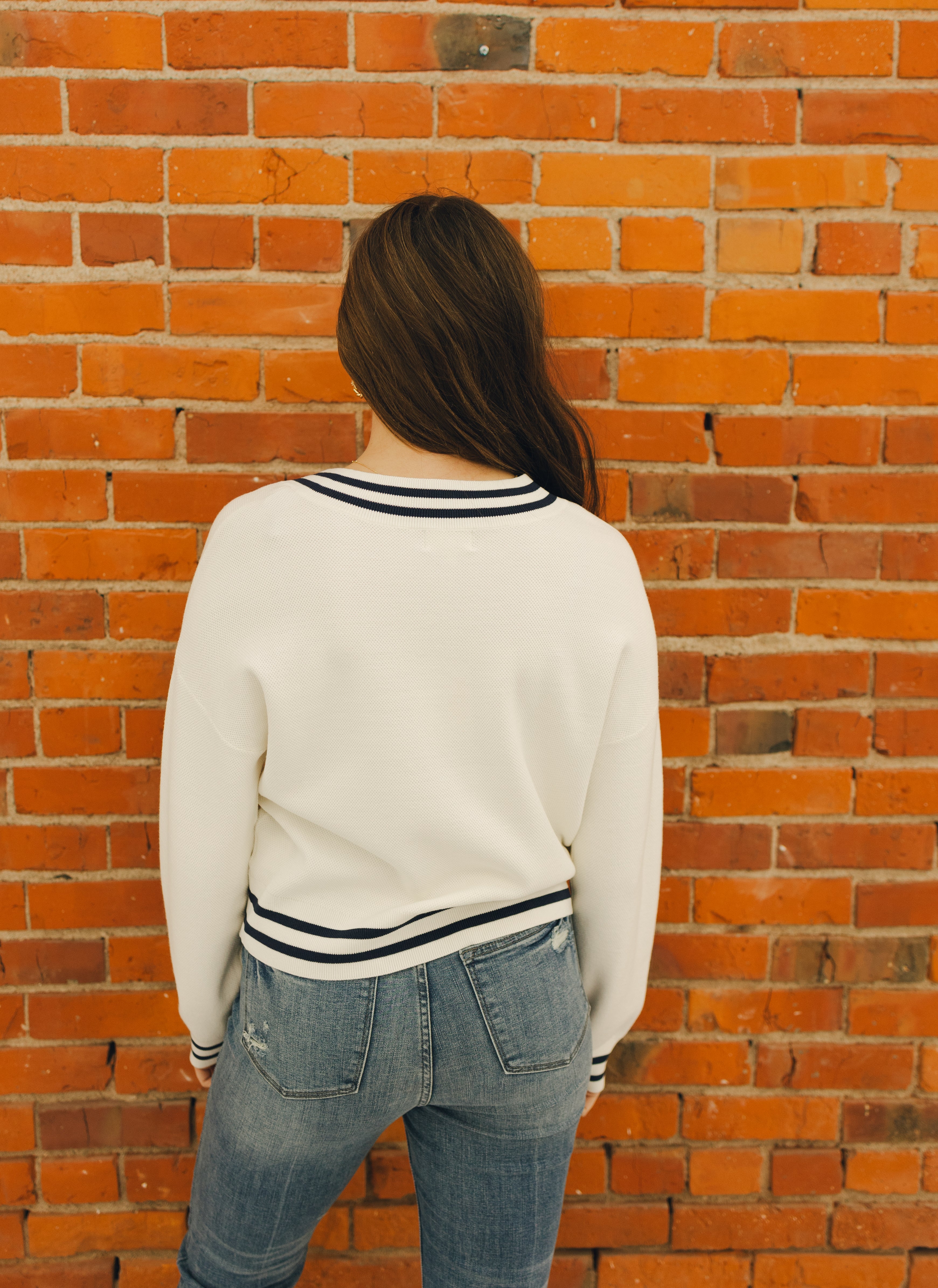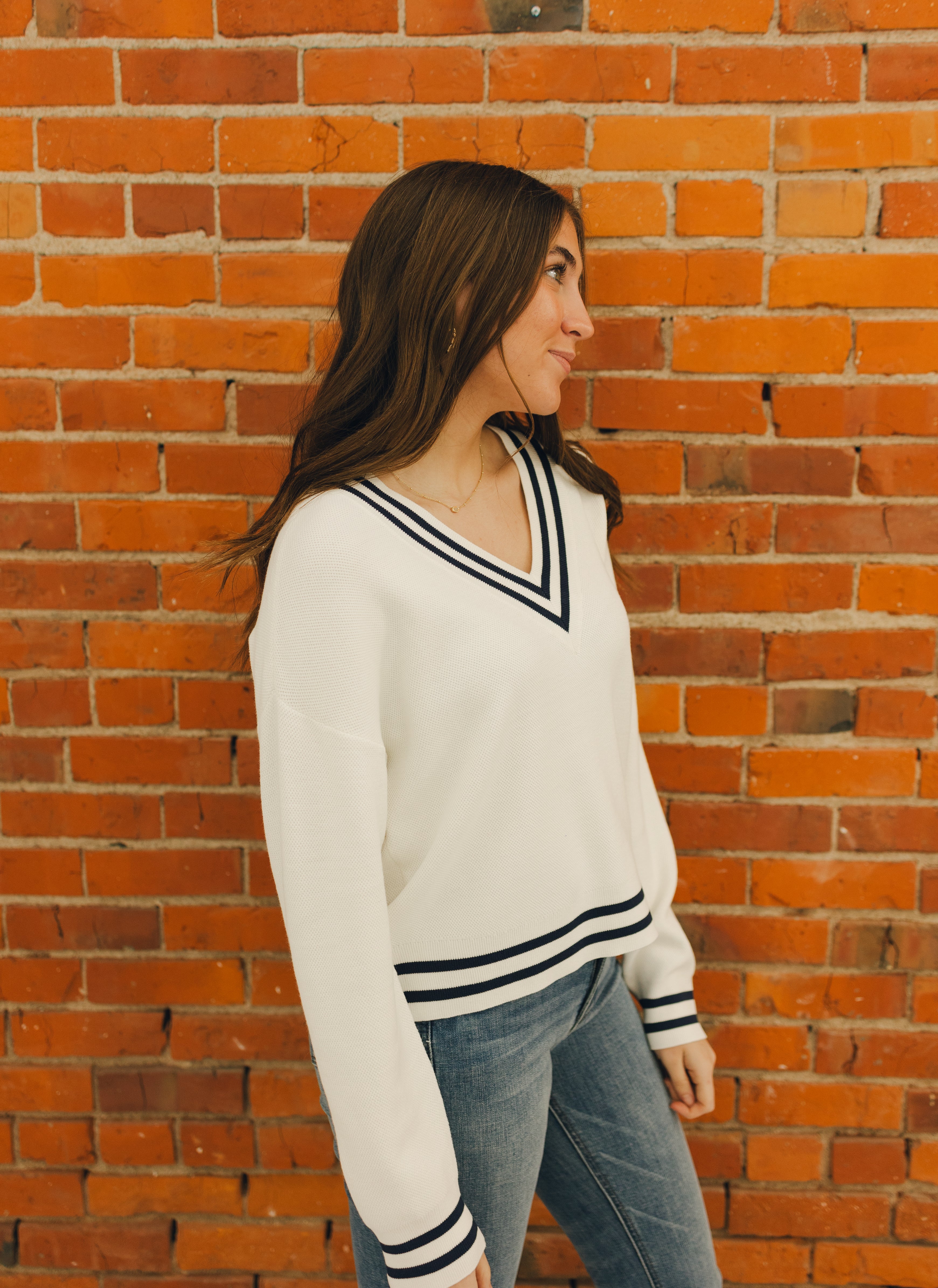 So classic from our Spring collection, this v-neck sweater is featured in a soft knit fabrication with stripped hem detailing and ribbed trim.