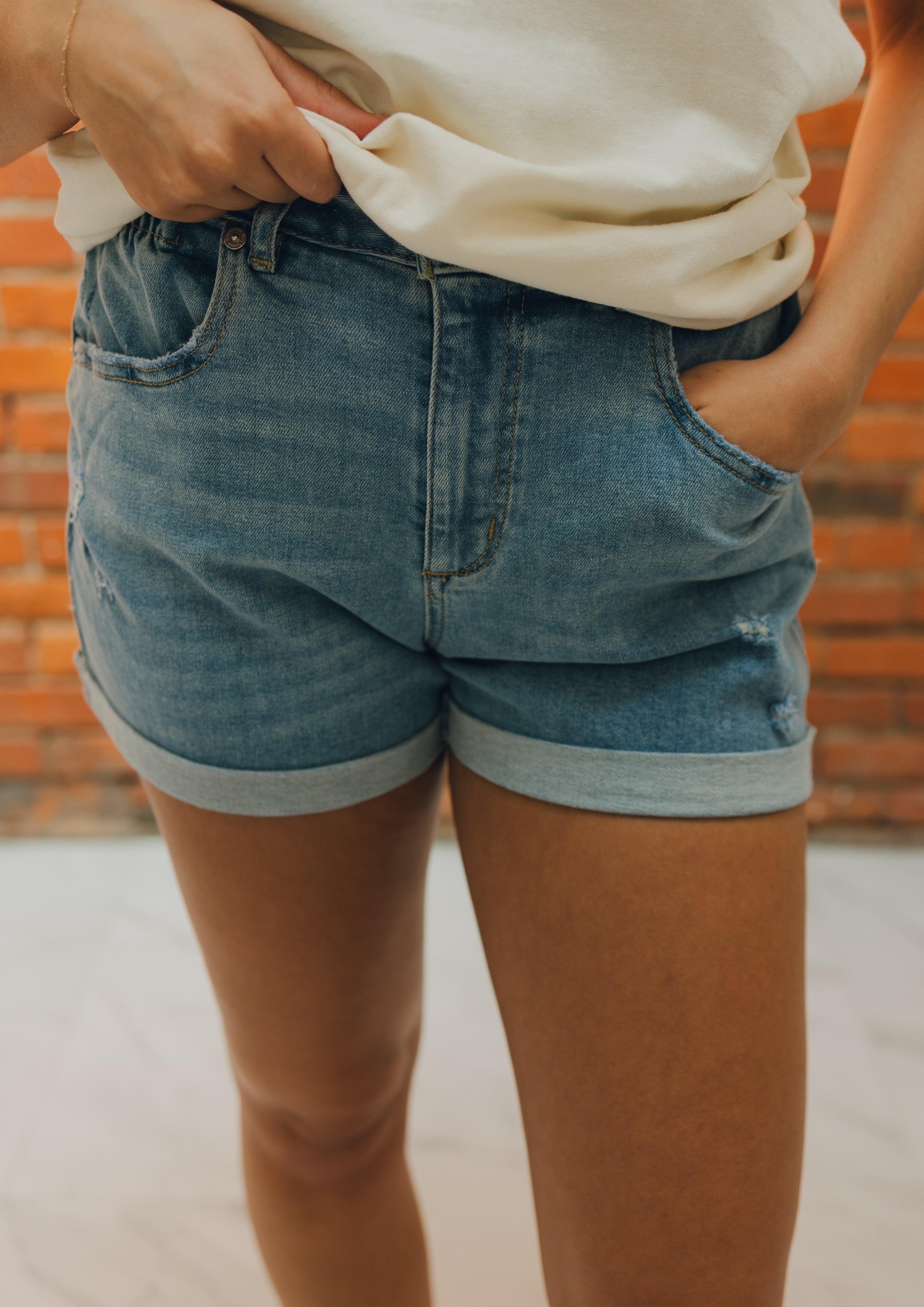 Enjoy all-day comfort with the relaxed fit and limitless stretch of these wide-leg jean shorts. The distressed detailing adds a vintage-inspired flair, while the high-rise cut flatters your waist. Functional pockets complete the look with a practical touch.