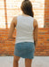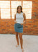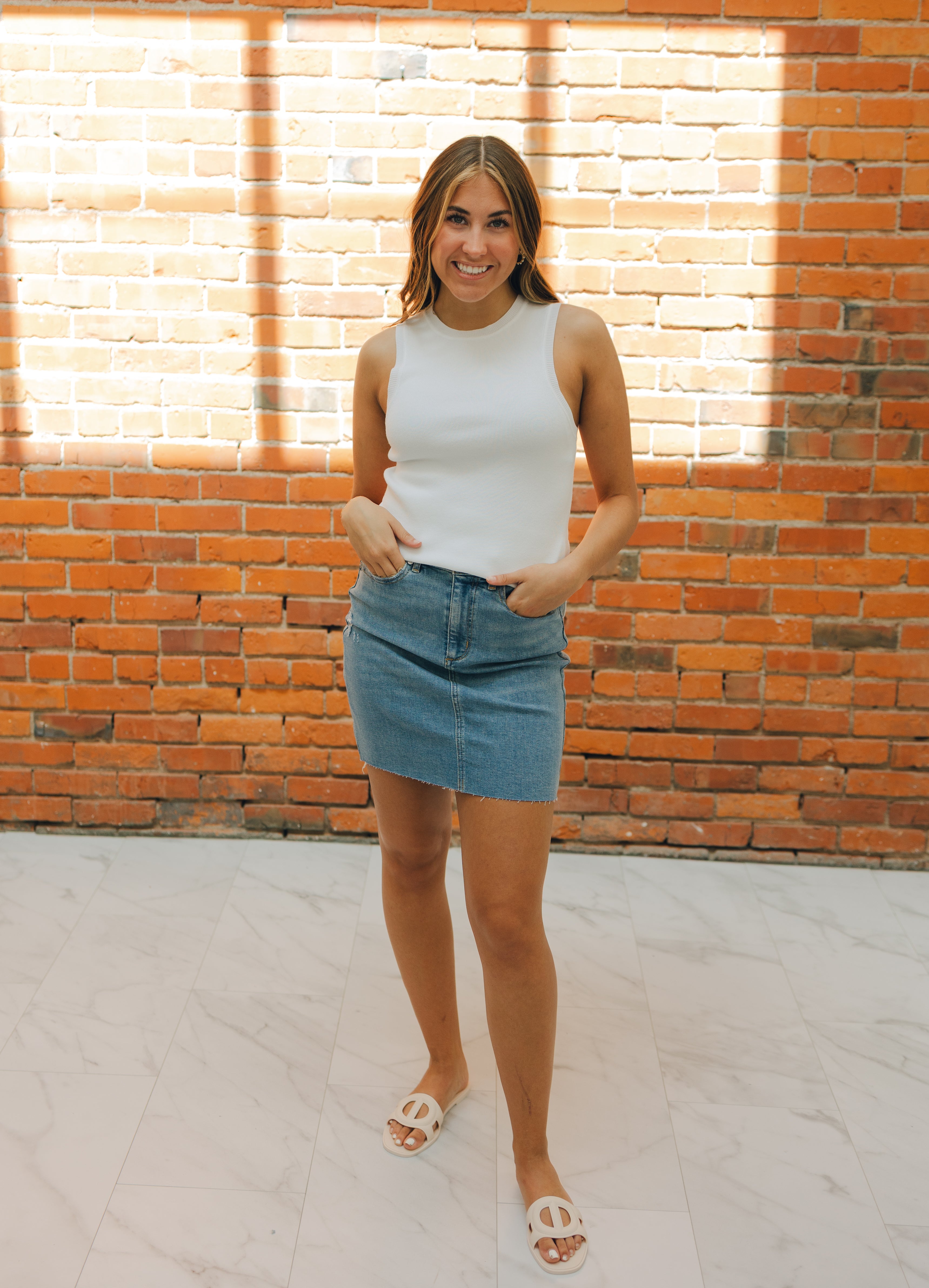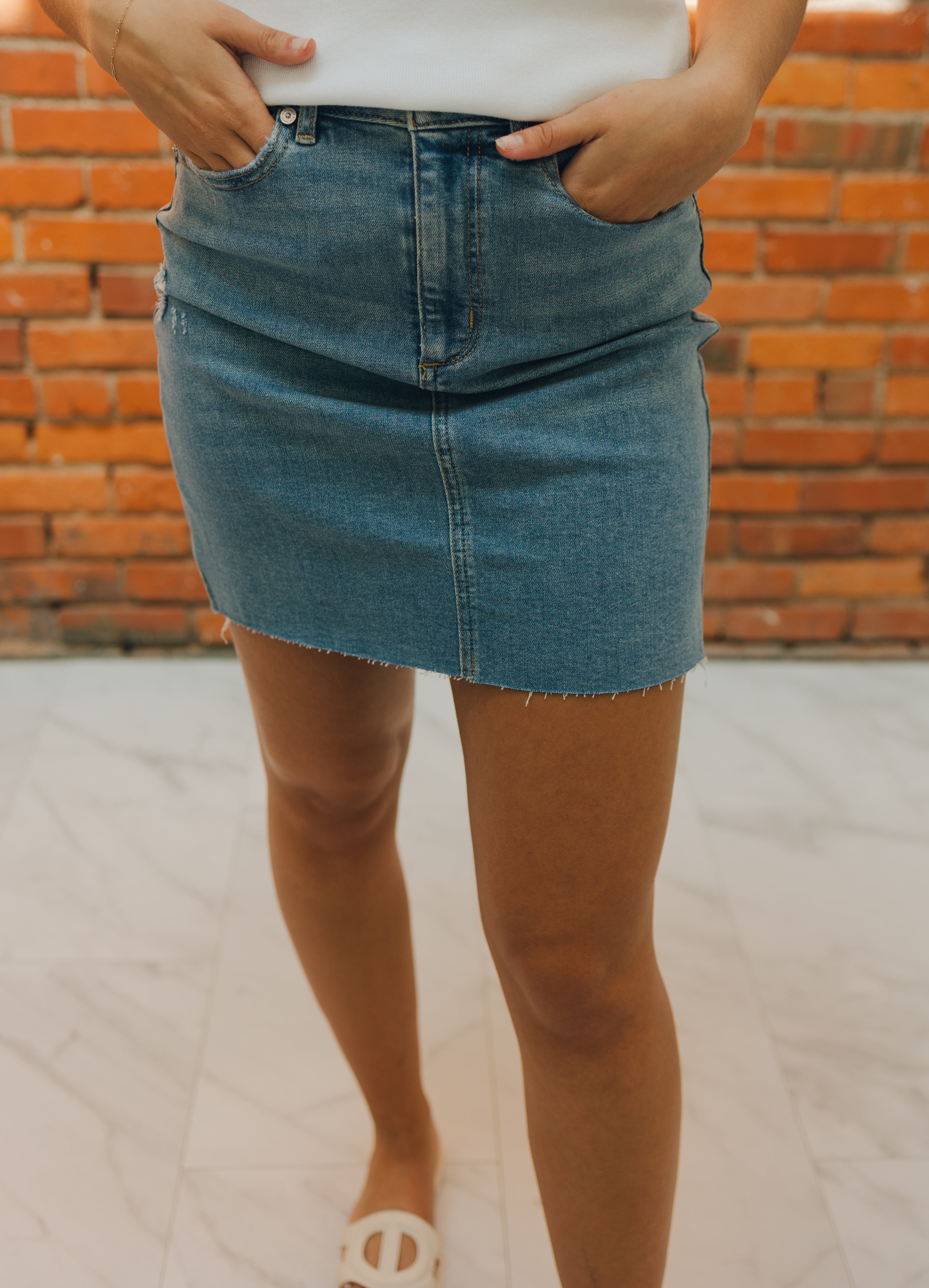 Crafted from limitless stretch denim, this skirt blends casual comfort with effortless movement. Its figure-hugging upper fit flatters your silhouette, while five pockets provide practical convenience. The raw hem adds a carefree charm, completing the look with style.