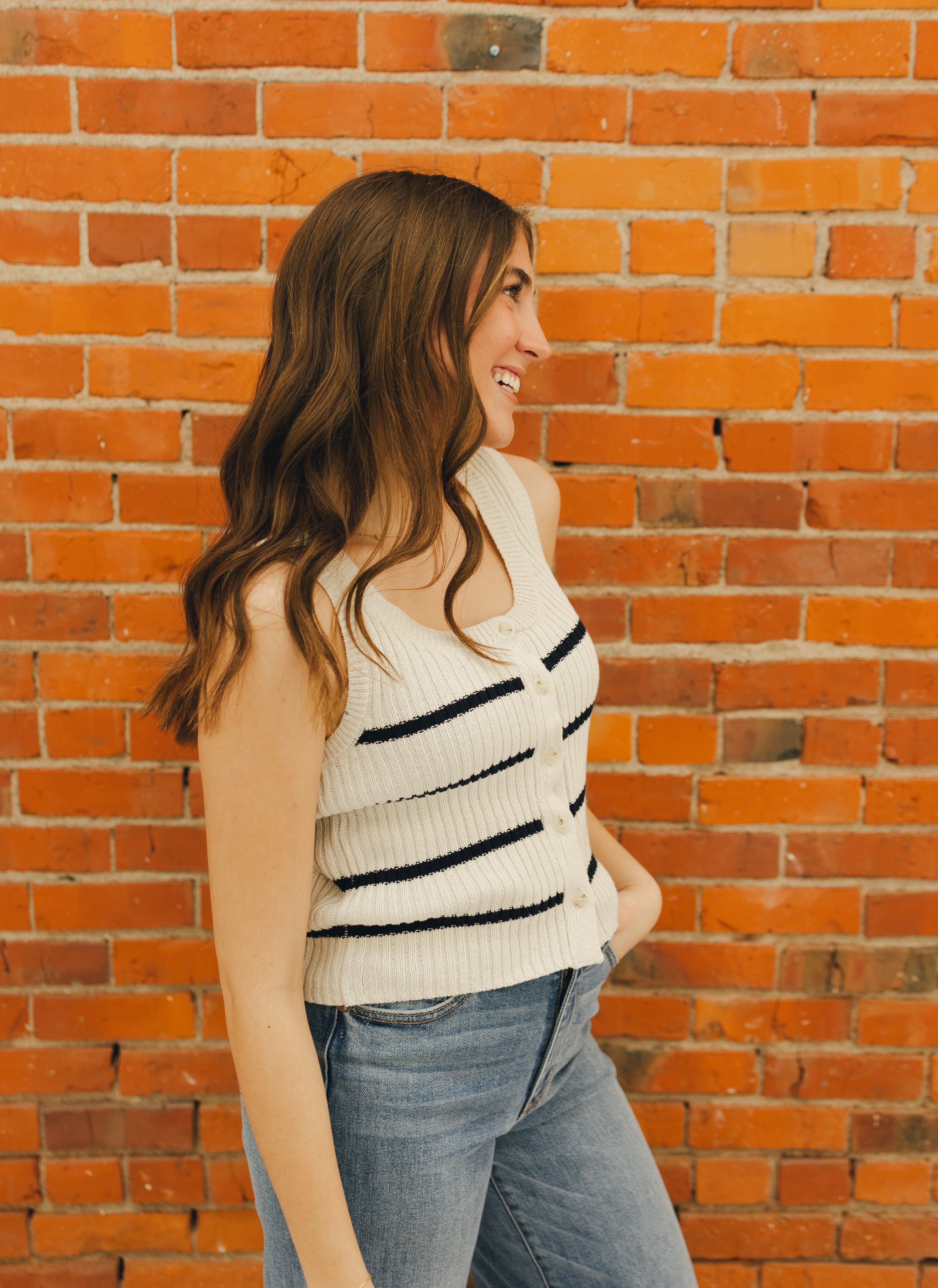 A modern-meets-vintage vibe, this striped button-up vest is made from textured crochet and features a scoop neck for an easy, wearable fit. Style it solo or layered for a look that’s effortlessly chic.